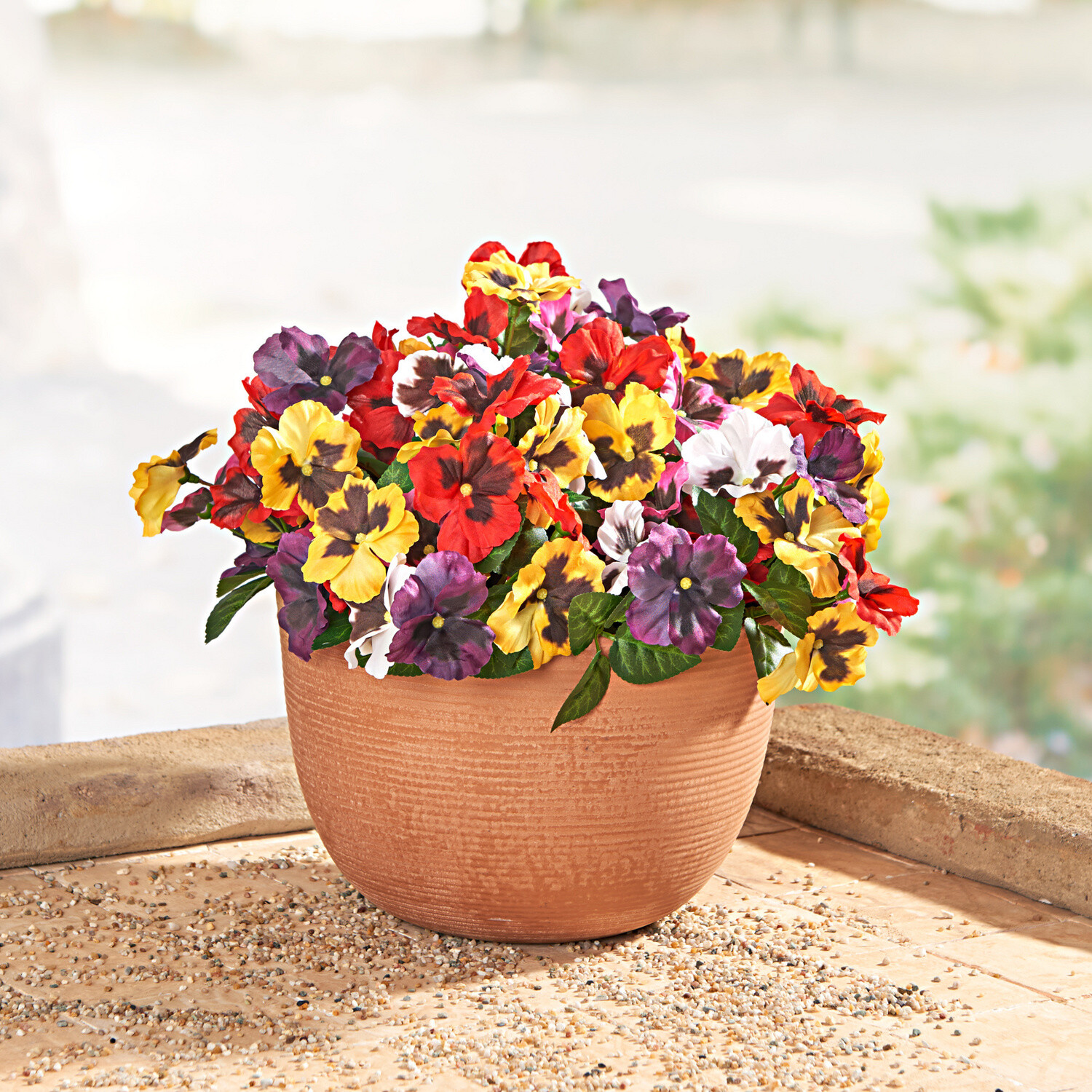 Jako čerstvě osázený: nádherný závěsný květináč v terakotovém vzhledu s realisticky vypadajícími maceškami, v jemných pastelových barvách. Vždy v plném květu, bez nutnosti zalévání a péče - v interiéru i exteriéru. Vzhled terakoty. K nerozeznání od pravých květů. Kvetou věčně. Gainsborough.