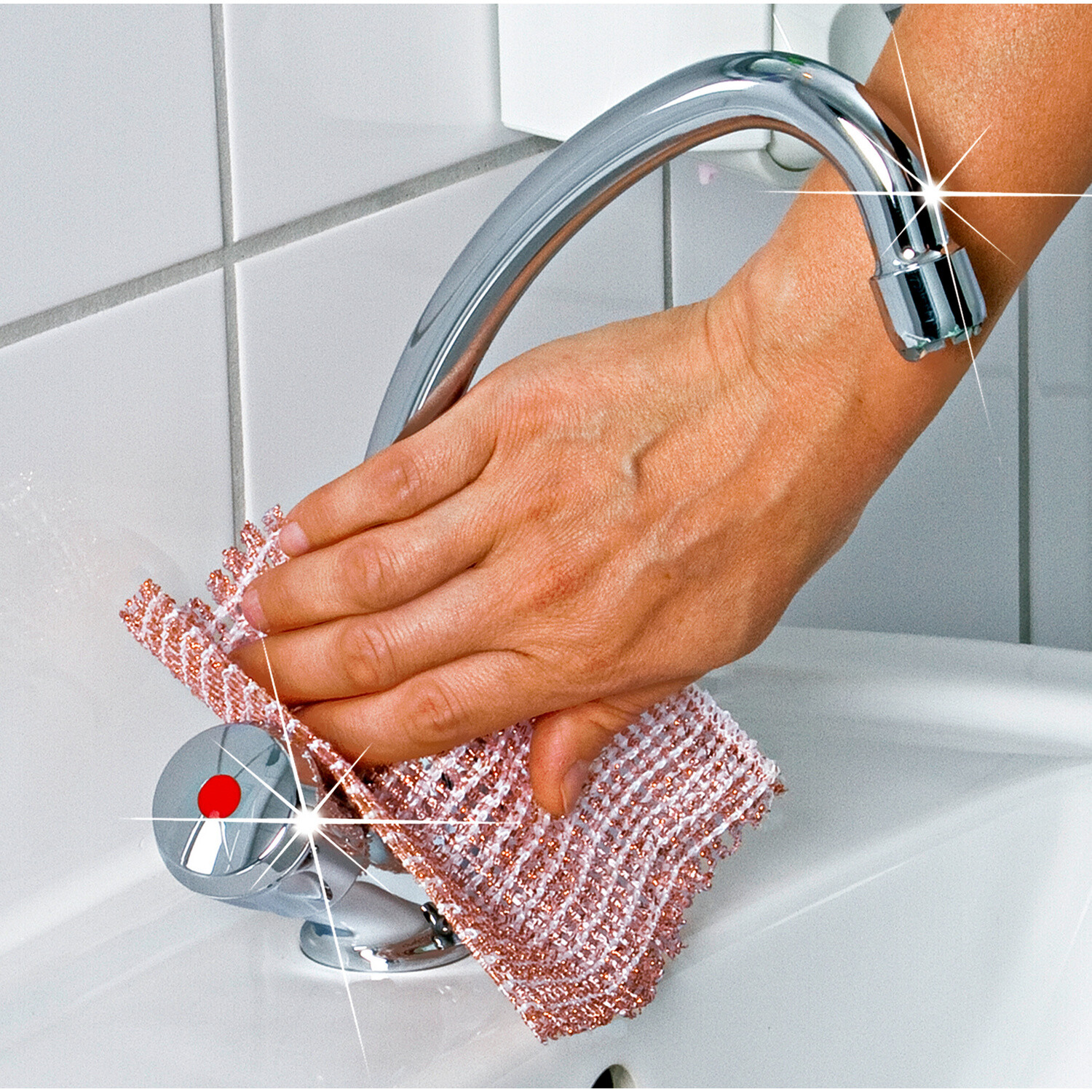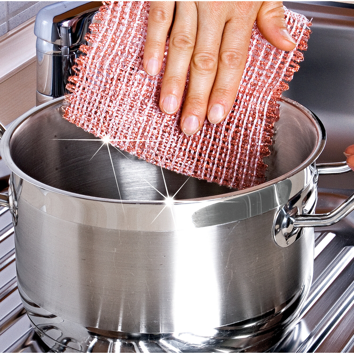 Konec namáhavému drhnutí! Pomocí měděného hadříku snadno vyčistíte Vaše hrnce, pánve, grilovací rošty - bez škrábanců. Na kov, sklo, porcelán atd.Pravá měď. Dvouvrstvé + dlouhá životnost. Vyrobeno v Německu. soupr. 3 ks.