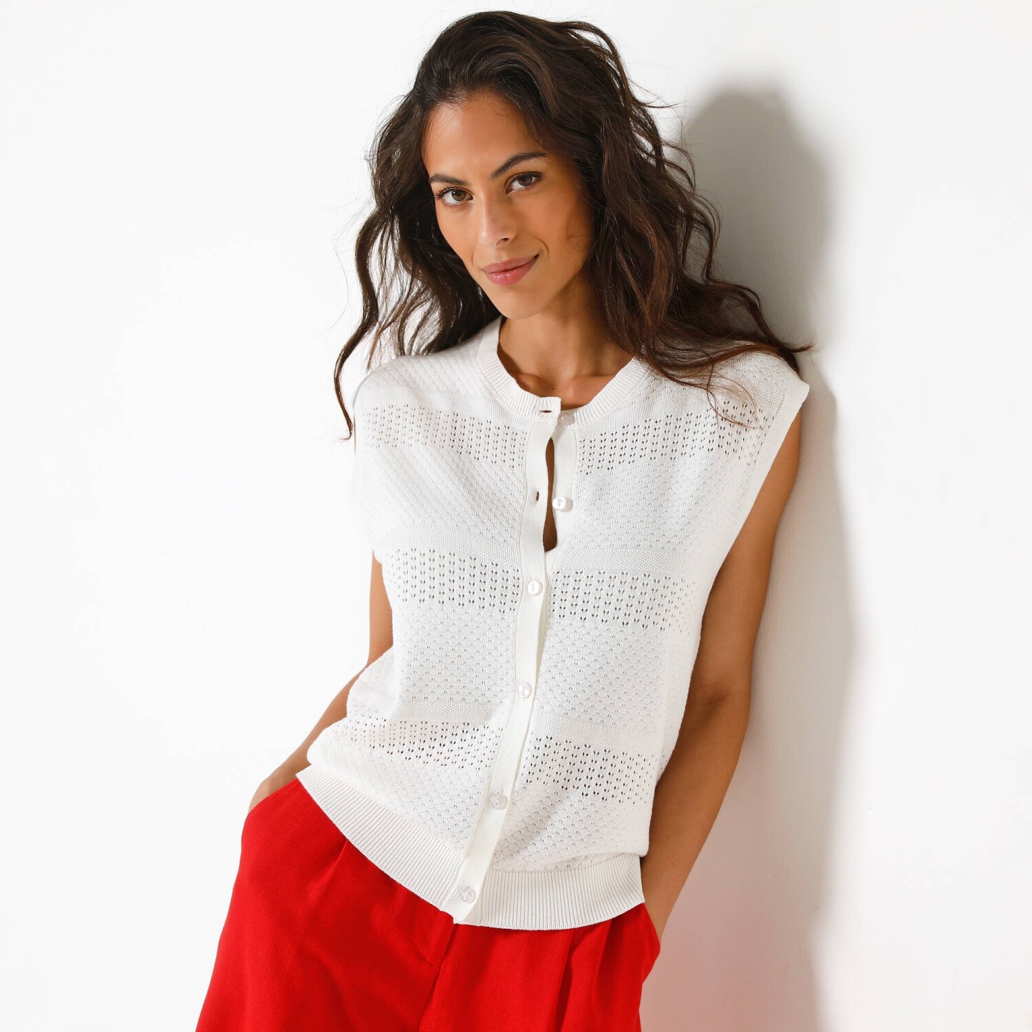 Halenka s krátkými rukávy z materiálu ideálního pro jarní a letní období. Krepon. Rovný aktuální střih. Kulatý výstřih zdůrazněný sámky vpředu. Vpředu celopropínací na knoflíčky. Knoflíky v perleťovém vzhledu. Krátké rukávy se 2 volány. Vzadu sedlo. Rovný dolní lem. Tento produkt byl vyroben z viskózy Lenzing™ EcoVero™. Ekologická viskóza je materiál vyrobený z buničiny z udržitelně obhospodařovaných lesů. Výrobní proces vyžaduje méně vody a energie. Lze prát v pračce.