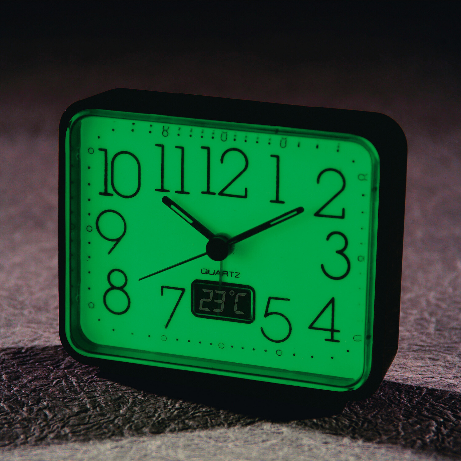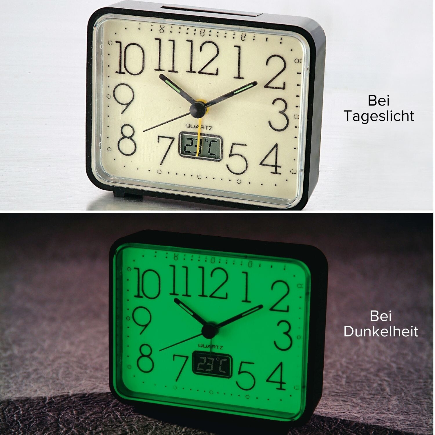 Tento budík umí víc než Vás pouze včas probudit. S osvětleným ciferníkem. S ukazatelem pokojové teploty. Svítí ve tmě. S funkcí budíku . Zřetelně čitelný ciferník . Objednejte si také: 8 tužkových baterií AA, 1,5 V. Provoz na 1 tužkovou baterii AA (není součástí).