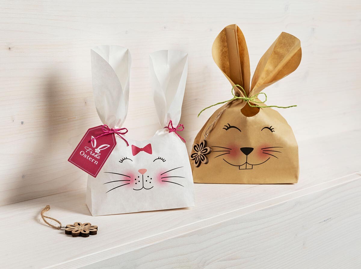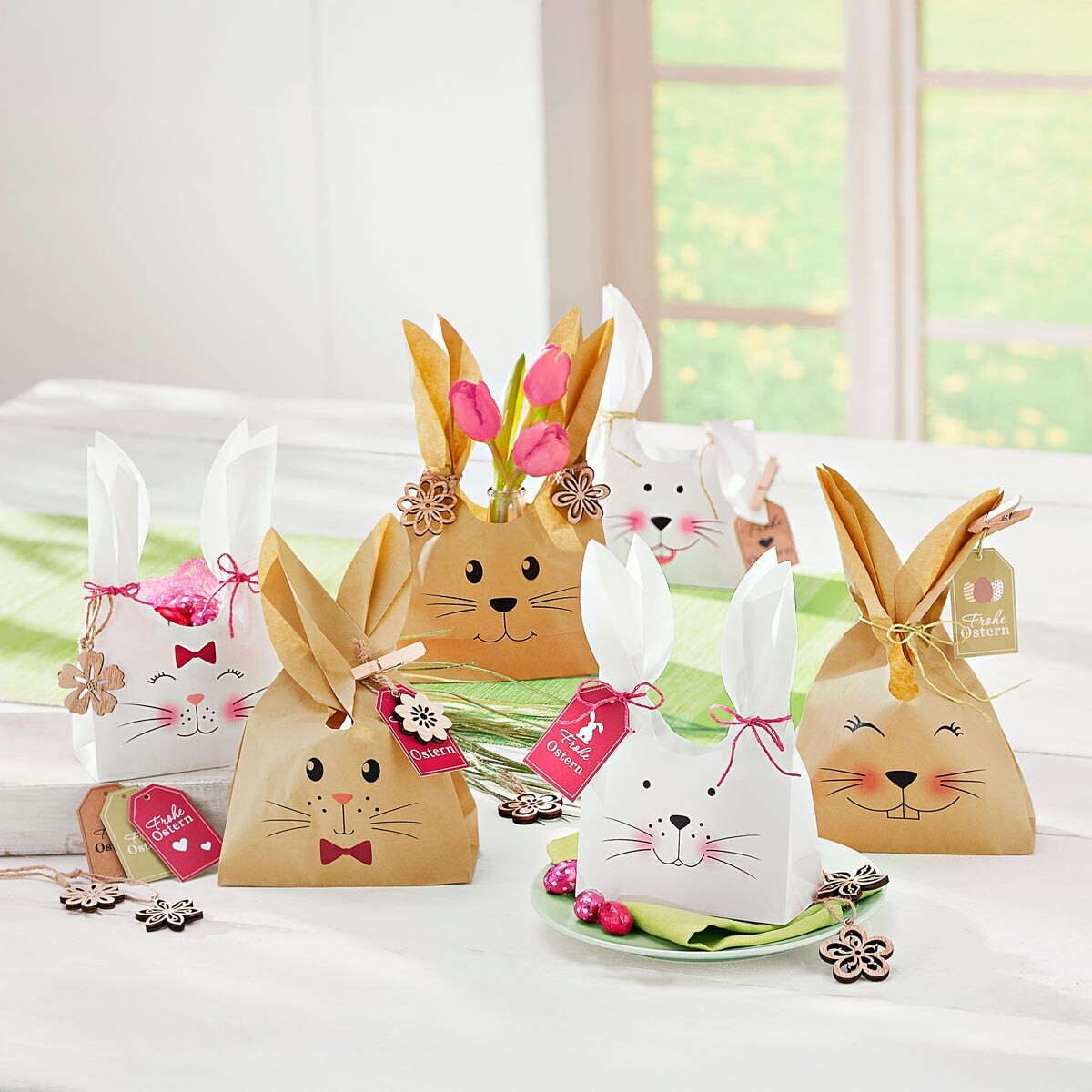 Kompletní sada pro výrobu velikonočních tašek obsahuje 12 sáčků s motivy králíčků ve dvou velikostech, dřevěné kytičky s provázky a kolíčky, visačky a tři barevné stuhy. Díky pevnému papíru a roztomilým dekoracím snadno vytvoříte originální balíček na sladkosti i malé překvapení. Jednoduché, rychlé a přitom nápadité balení, které udělá z každého dárku kouzelný velikonoční pozdrav. Materil: paír, dřevo. Rozměry: 13 x 15 cm, 21 x 25 cm.