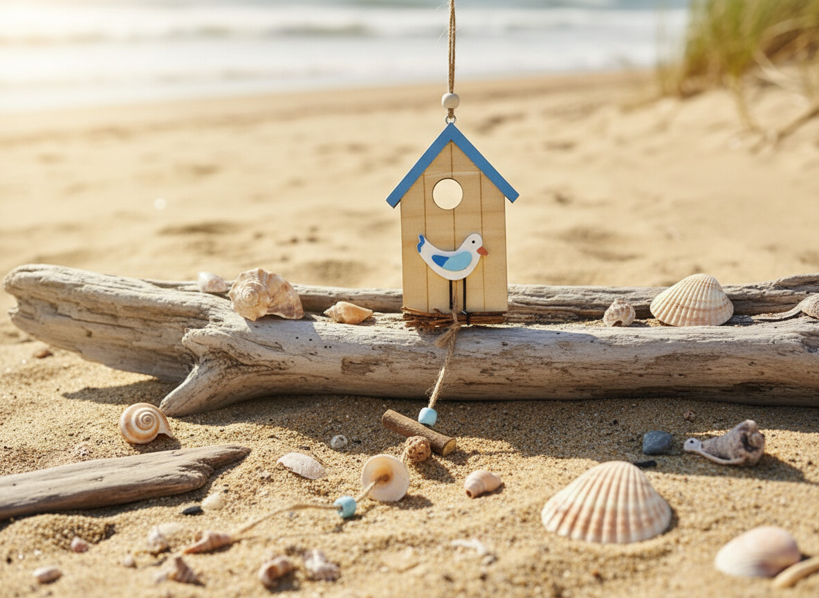 • Ptačí budka s plasticky vyobrazeným rackem a provazový žebřík s mušličkami, lasturami a dřevěnou rybičkou dokonale postačí k tomu, abyste si představili šumění moře a křik racků