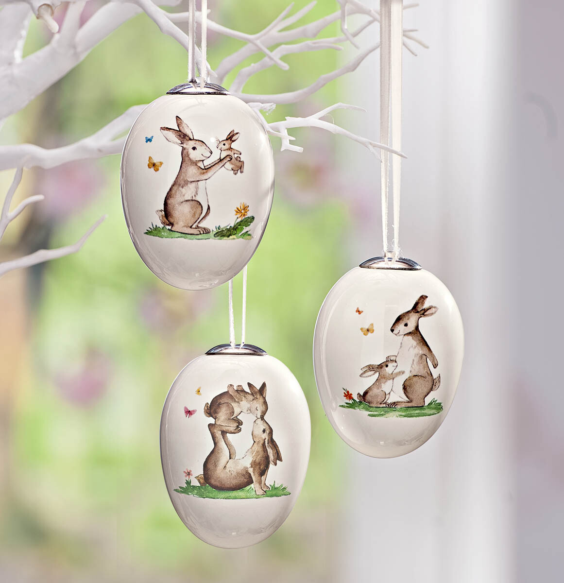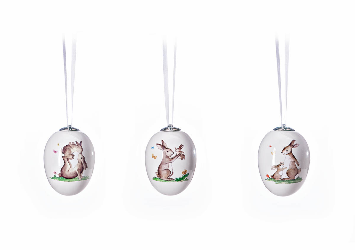 Trojice glazovaných kraslic s krásným potiskem zaječích radovánek ozdobí každou jarní kytici, velikonoční dekoraci nebo okna a záclonky. Materiál: keramika, satén. Rozměry: průměr 5 cm, výška 7 cm, závěs 12 cm.