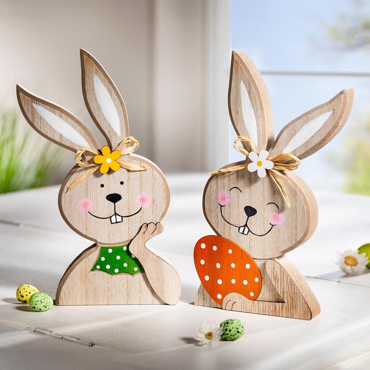 Roztomilá velikonoční dekorace, která vnese do vašeho domova veselou atmosféru. Tento 2dílný set obsahuje dva dřevěné zajíčky – Lisu a Lottu, každý vysoký cca 20 cm. Ideální velikonoční dekorace na stůl, parapet, poličku nebo jako dárek. Můžete je vystavit samostatně nebo jako dvojici. Tyto dvě malé dřevěné postavičky jsou skvělým způsobem, jak přidat do domácnosti nádech jara a hravosti. Materiál: dřevo. Rozměry: 12 x 2 x 20 cm.