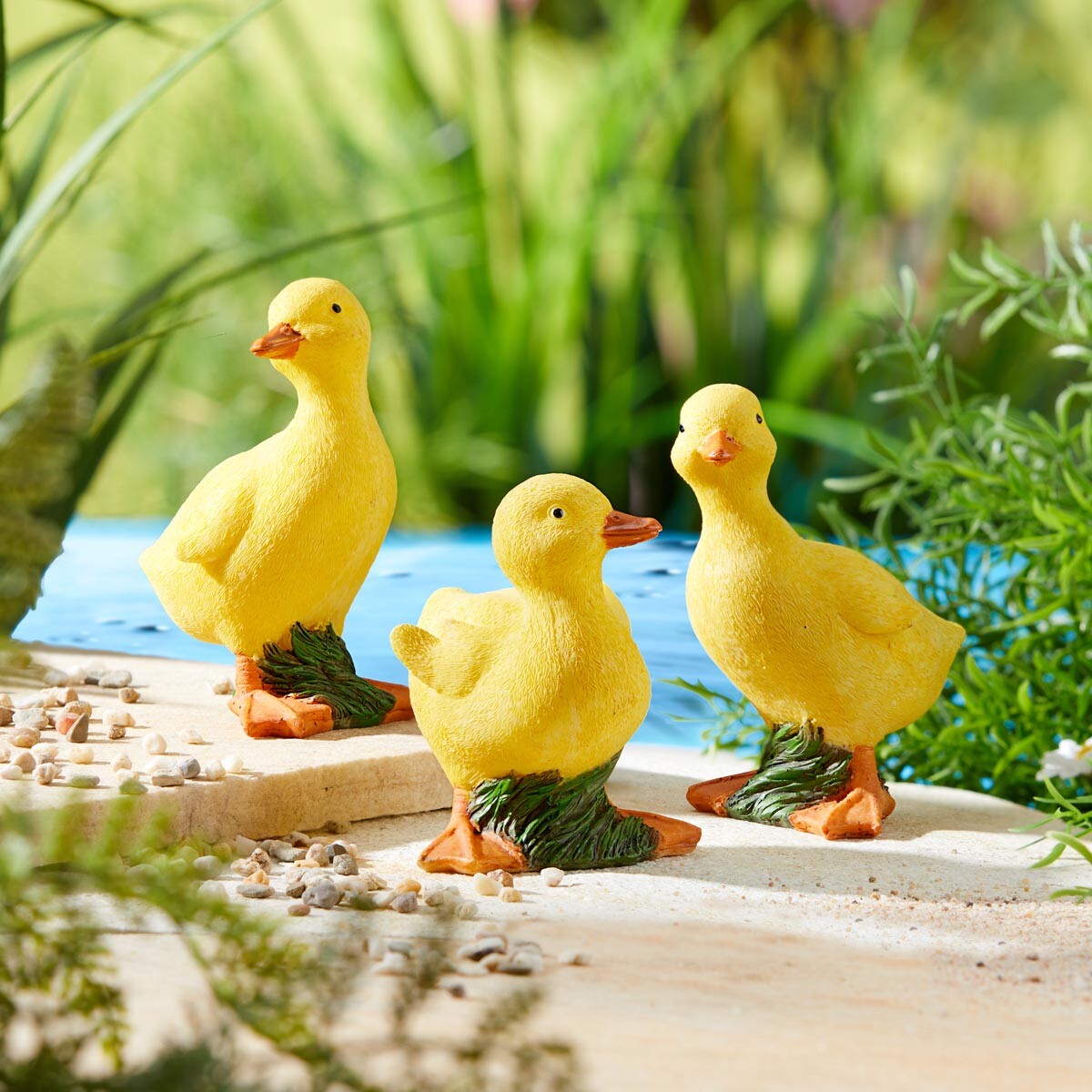 Skutečně roztomilá kachňátka budou ozdobou každé zahrady. Figurky jsou vyrobeny z umělého kamene, odolného vůči nepřízni počasí. Ozdobte si jimi zahradu, terasu nebo i interiér. Materiál: umělý kámen. Rozměry: 7 x 6 x 7 cm.