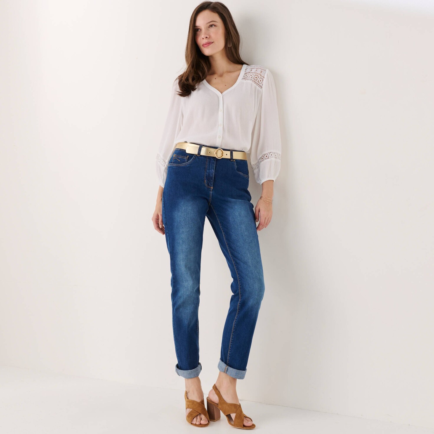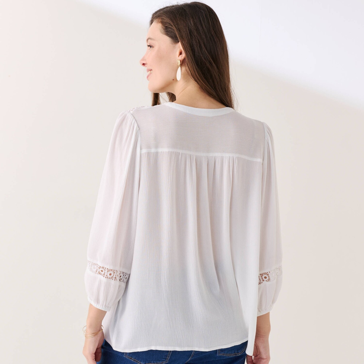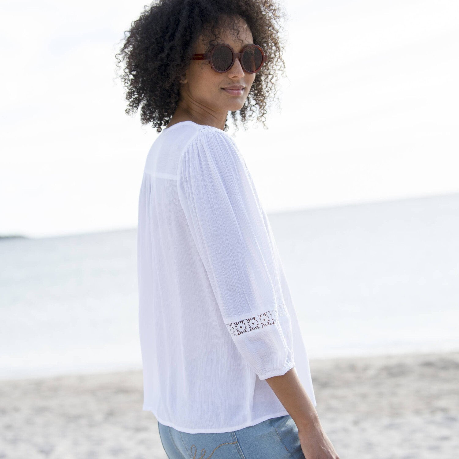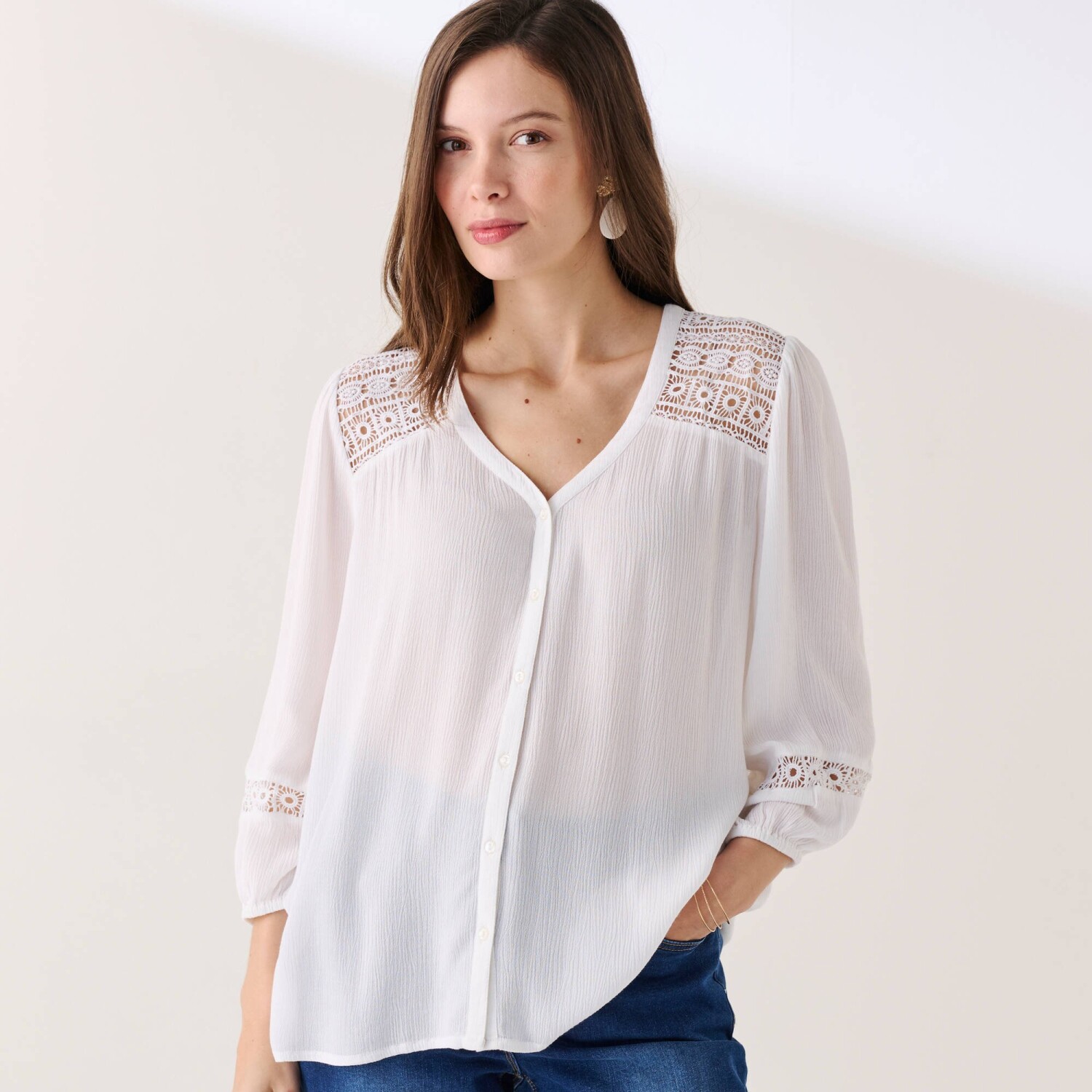 Halenka s potiskem patří mezi módní trumfy této sezóny. Originální límeček. Vpředu celopropínací, s nařaseným volánem po celé délce knoflíkové légy. Vpředu a vzadu v ramenou přestřižení, vzadu nařasení. Krátké rukávy s nařasením v ramenou. Lze prát v pračce.