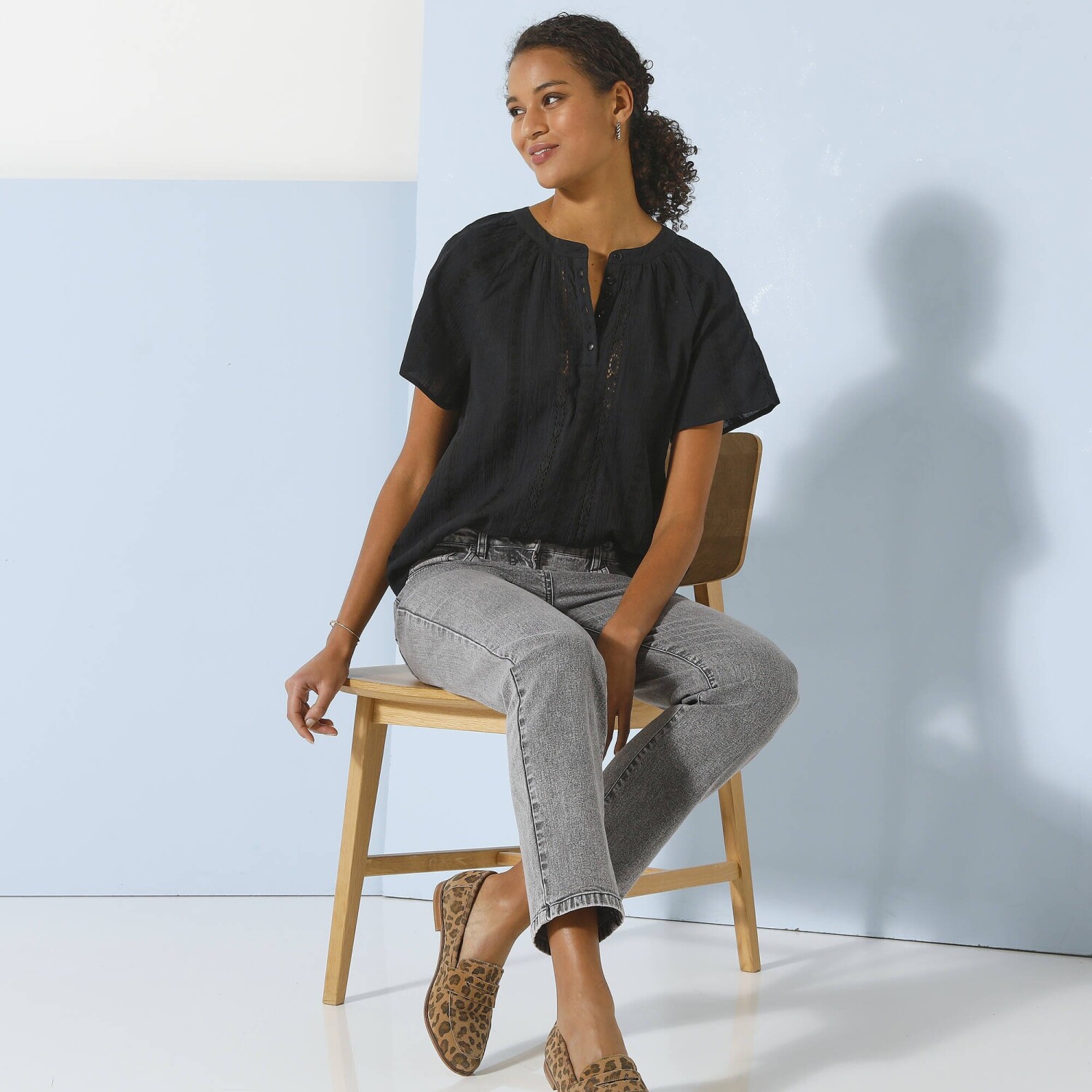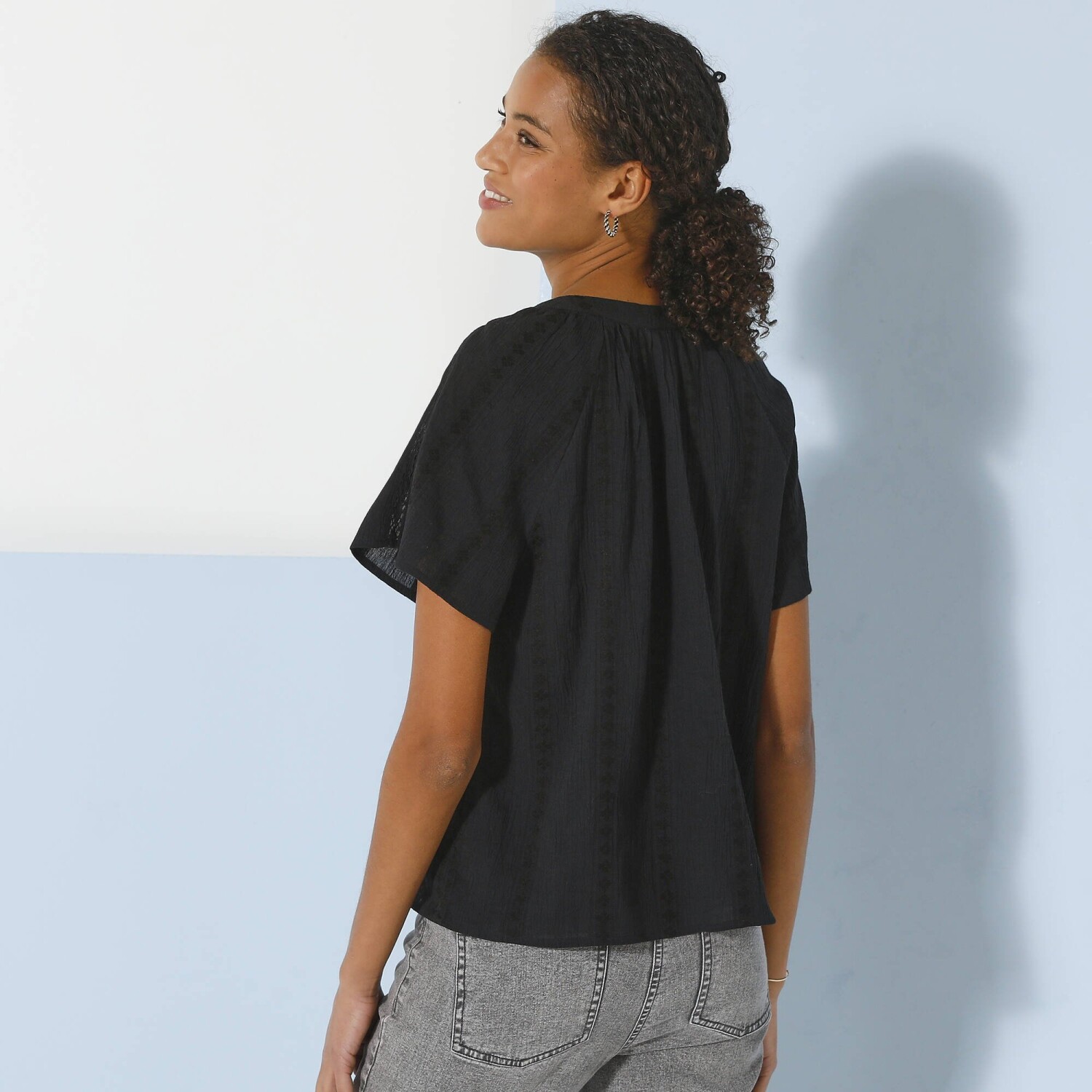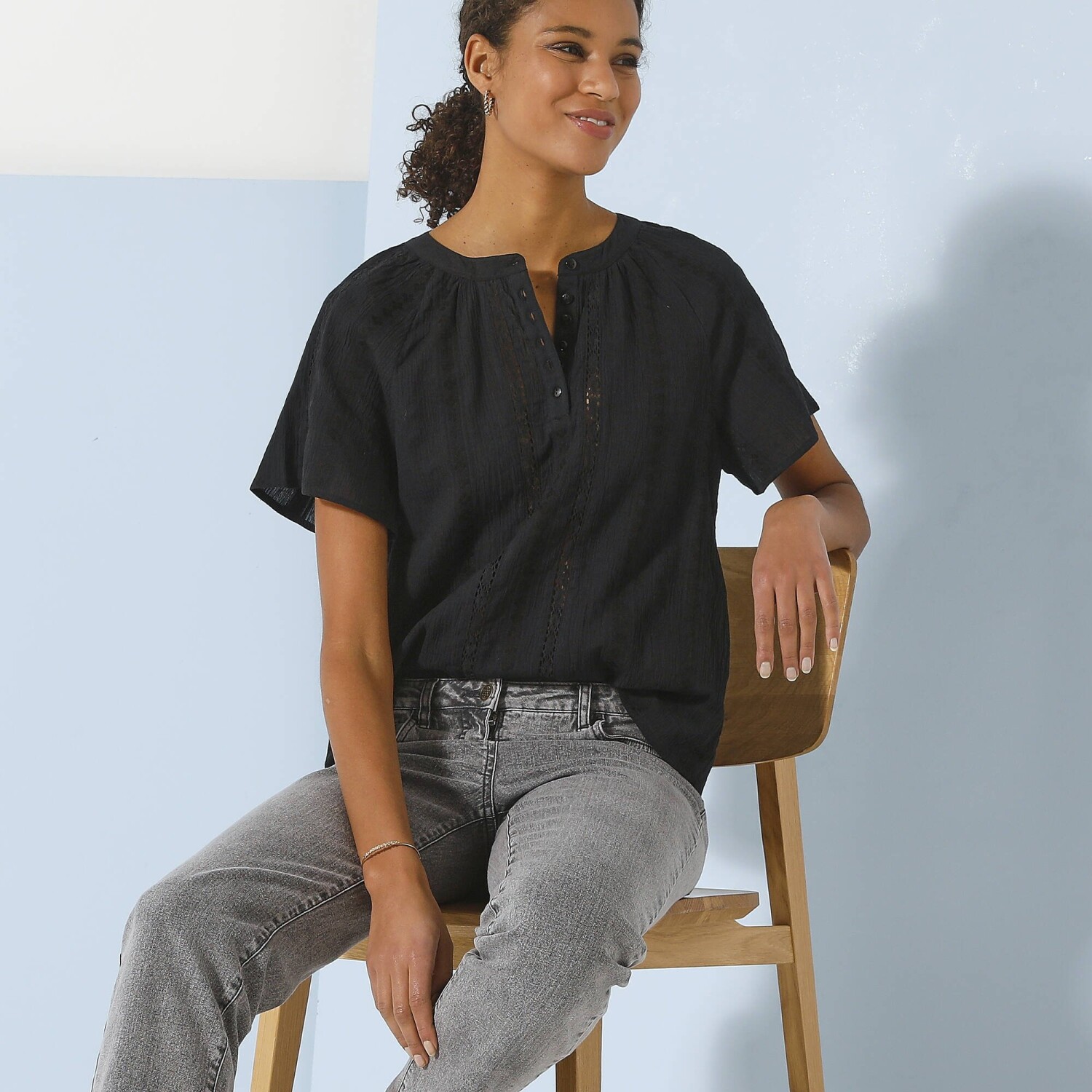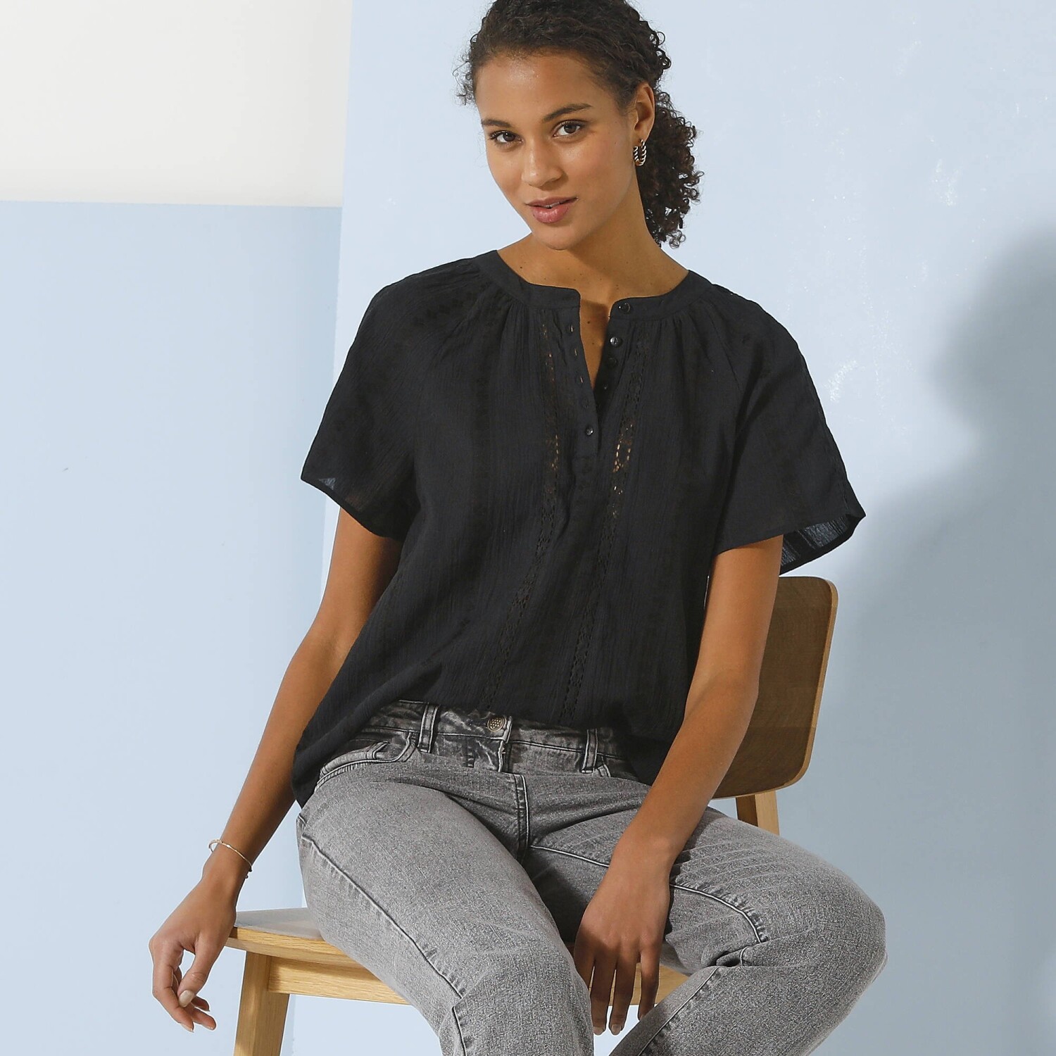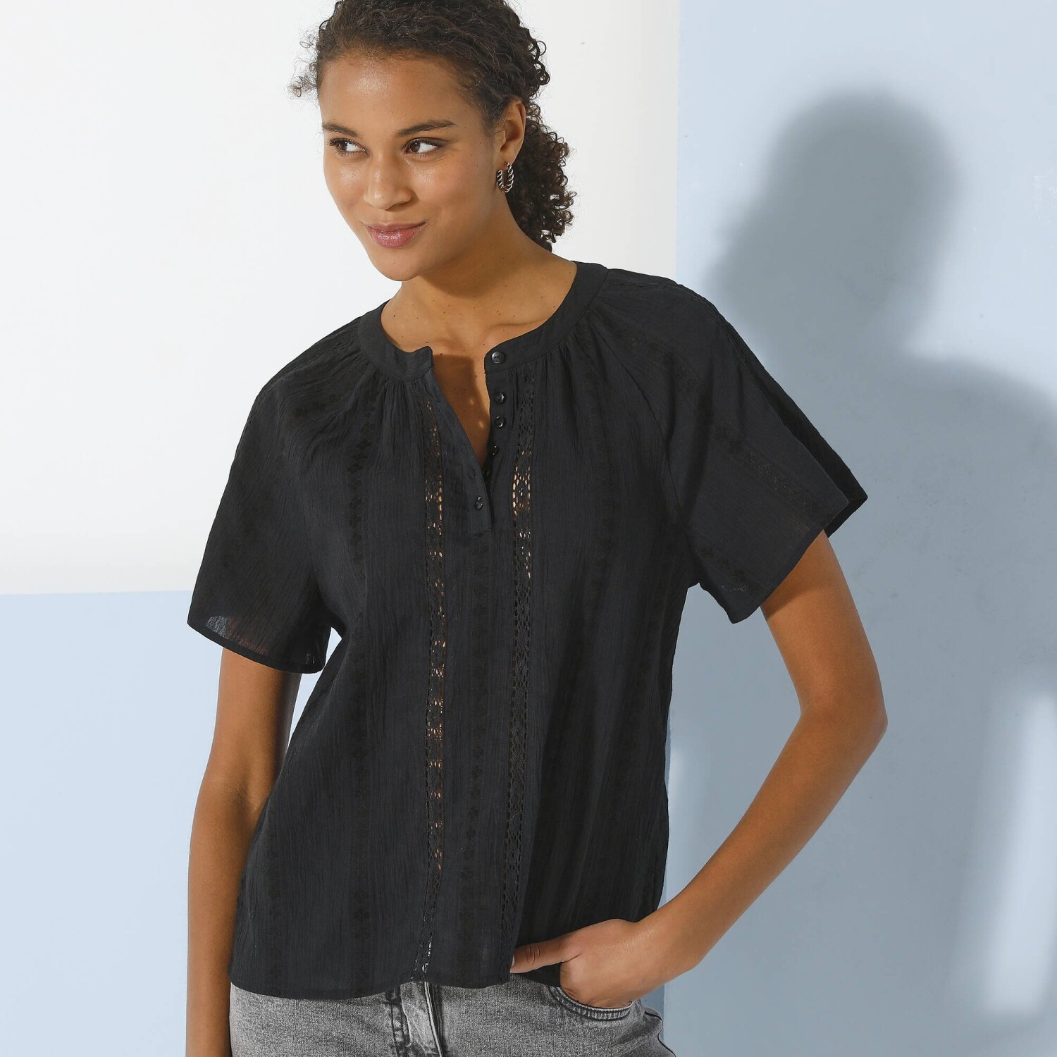 Romantická jednobarevná halenka se hodí k džínům i sukni, vždy bude skvělou volbou. Kulatý výstřih s knoflíkovou légou. Široké krátké rukávy, raglánové průramky. Originální propracovaná tkanina. Vpředu a na rukávech macramé pruhy. Lze prát v pračce.