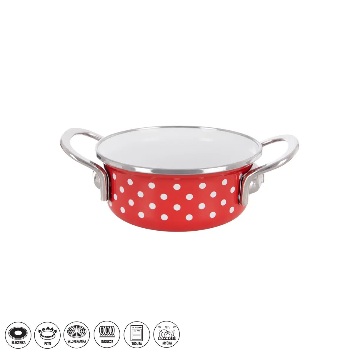 Smaltované nádobí nabízí možnost zdravého vaření bez uvolňování nebezpečných a nežádoucích látek do jídel. Nádobí naakumuluje teplotu a dlouho ji udrží. Vyznačuje se dlouhou životností, zdravotní nezávadností pro alergiky, univerzálním použitím. Sortiment smaltovaného nádobí v provedení TEČKA doplňuje nerezové kování. Kastroly se výborně hodí na přípravu jíšky, smažené cibulky, rozpouštění másla. Jsou vhodné na všechny typy spotřebičů včetně indukce, do trouby, do myčky na nádobí. Nejsou vhodné do MVT. Na tento kastroly se hodí skleněná poklice z naší nabídky kat. č. C009014012. Materiál: smaltovaný plech, nerez (lem), pochromovaný kov (držadla). Rozměry: průměr 12 cm, výška 6 cm, objem 0,65 l.