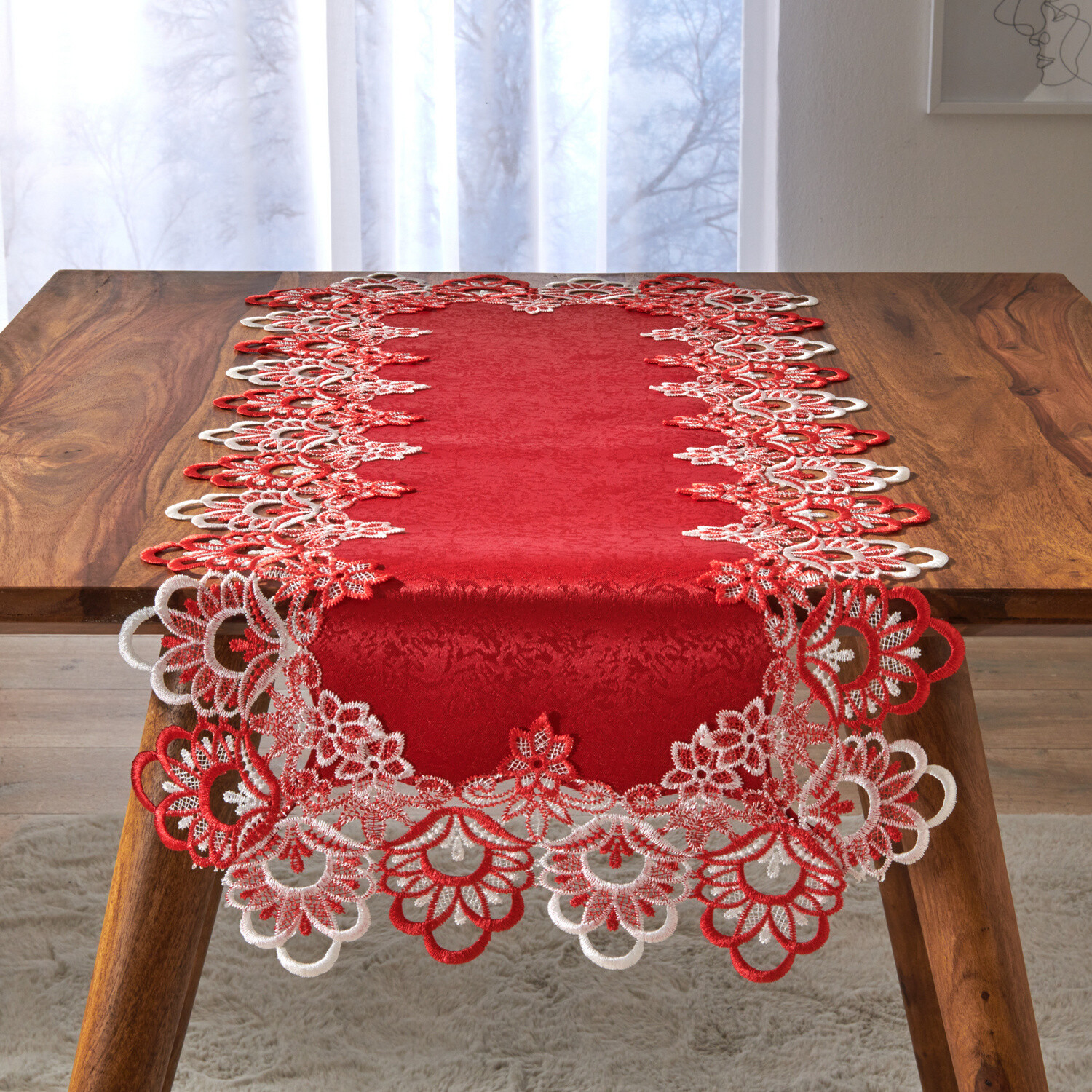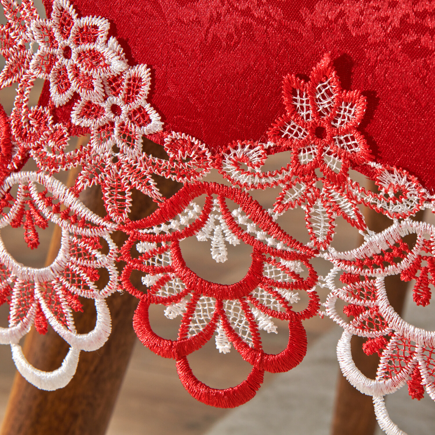 Exkluzivní ubrus z kvalitní žakárové tkaniny s bohatou výšivkou a filigránským krajkovým lemem s matným/lesklým efektem. Ideální pro různé slavnostní příležitosti.