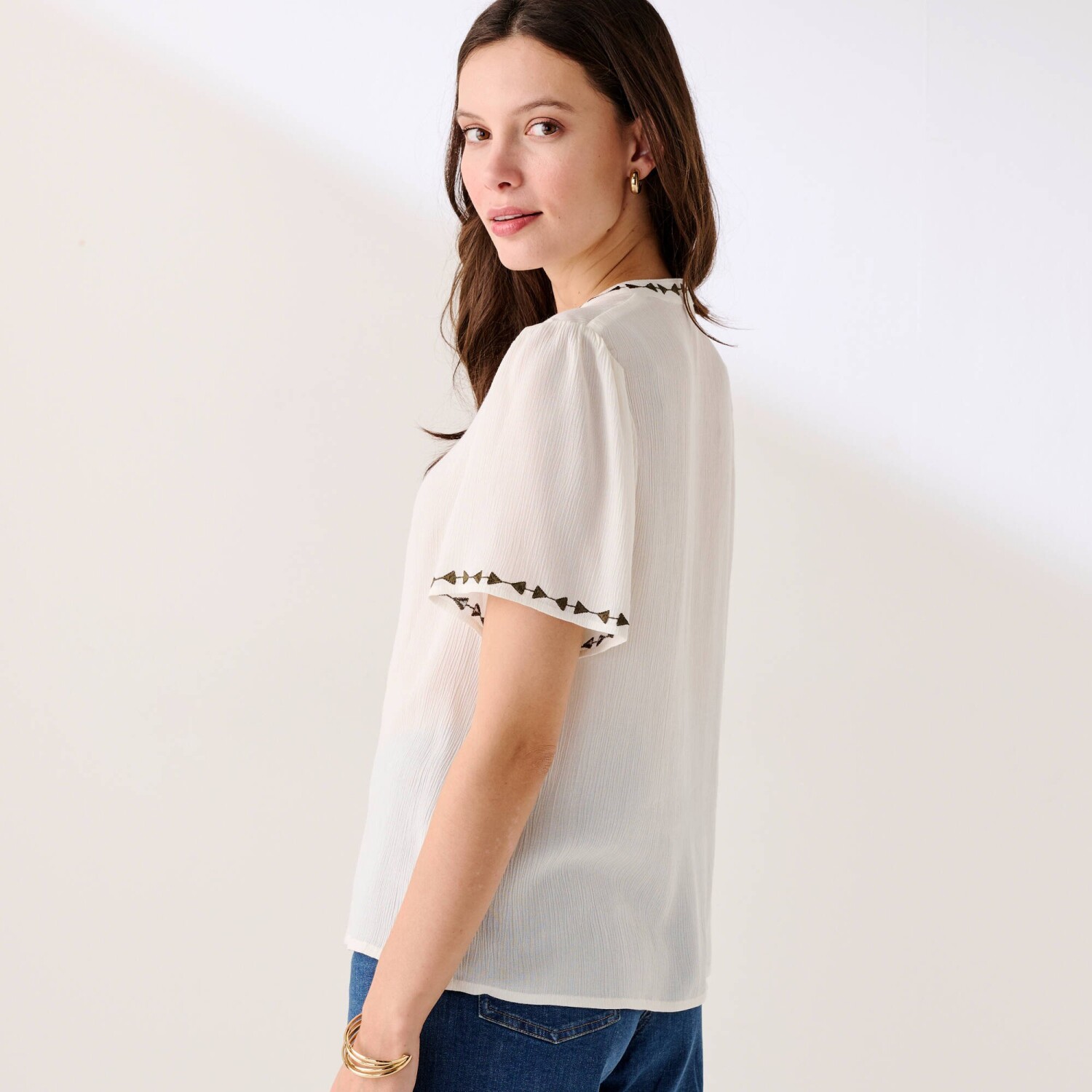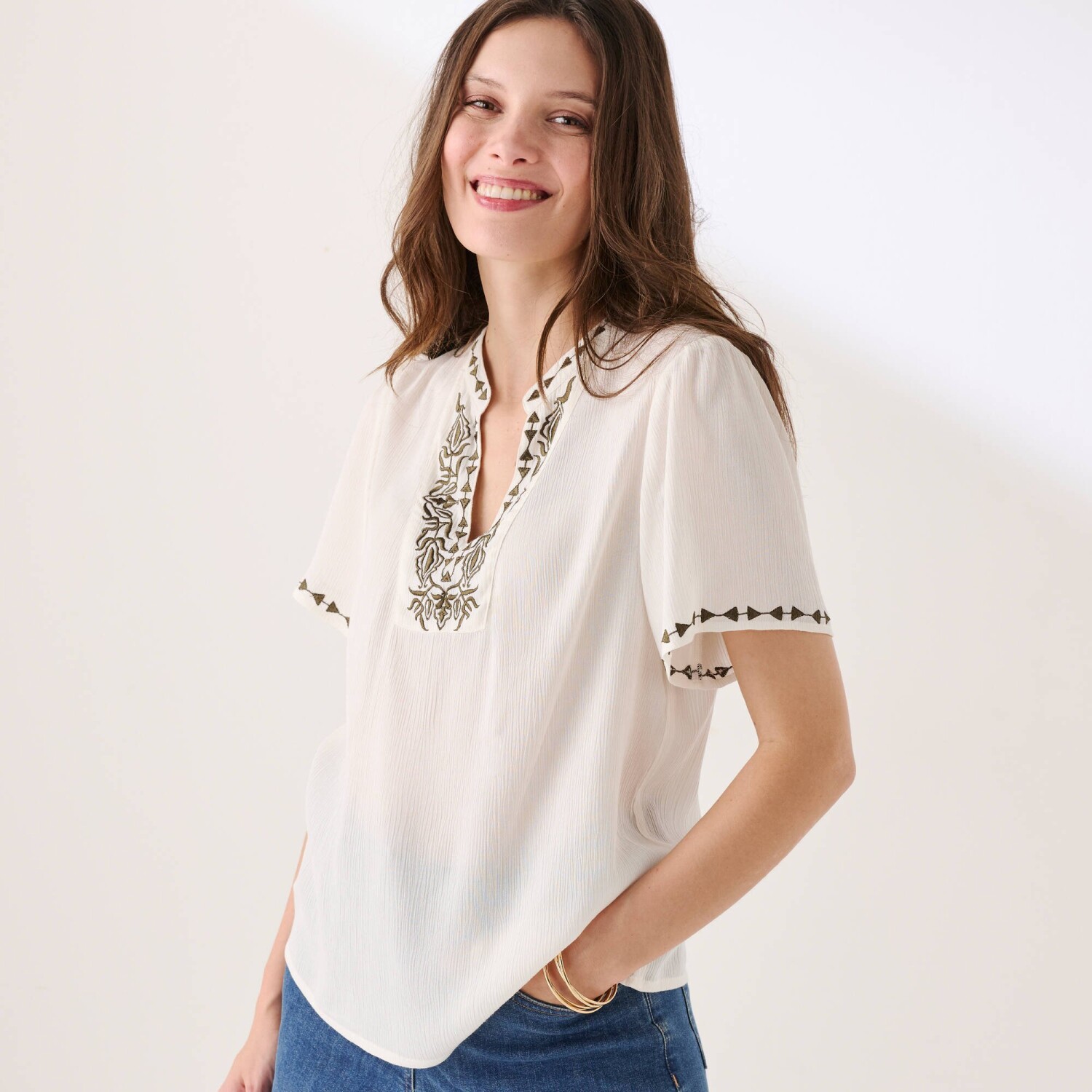 Náš favorit: bavlněná halenka s anglickou výšivkou, která dodává lehkost a ženskost! Zdobená nadčasovým kostkovaným vzorem, skvělá ke světlým džínům nebo midi sukni pro romantický jarní look. Stojáček s nařaseným volánem z anglické výšivky. Prsní záševky. Vpředu knoflíková léga. Široké rukávy k loktům s úzkou manžetou. V ramenou nařasení. Vzadu sedlo zdobené nařasením. Rovný dolní lem. Lze prát v pračce.