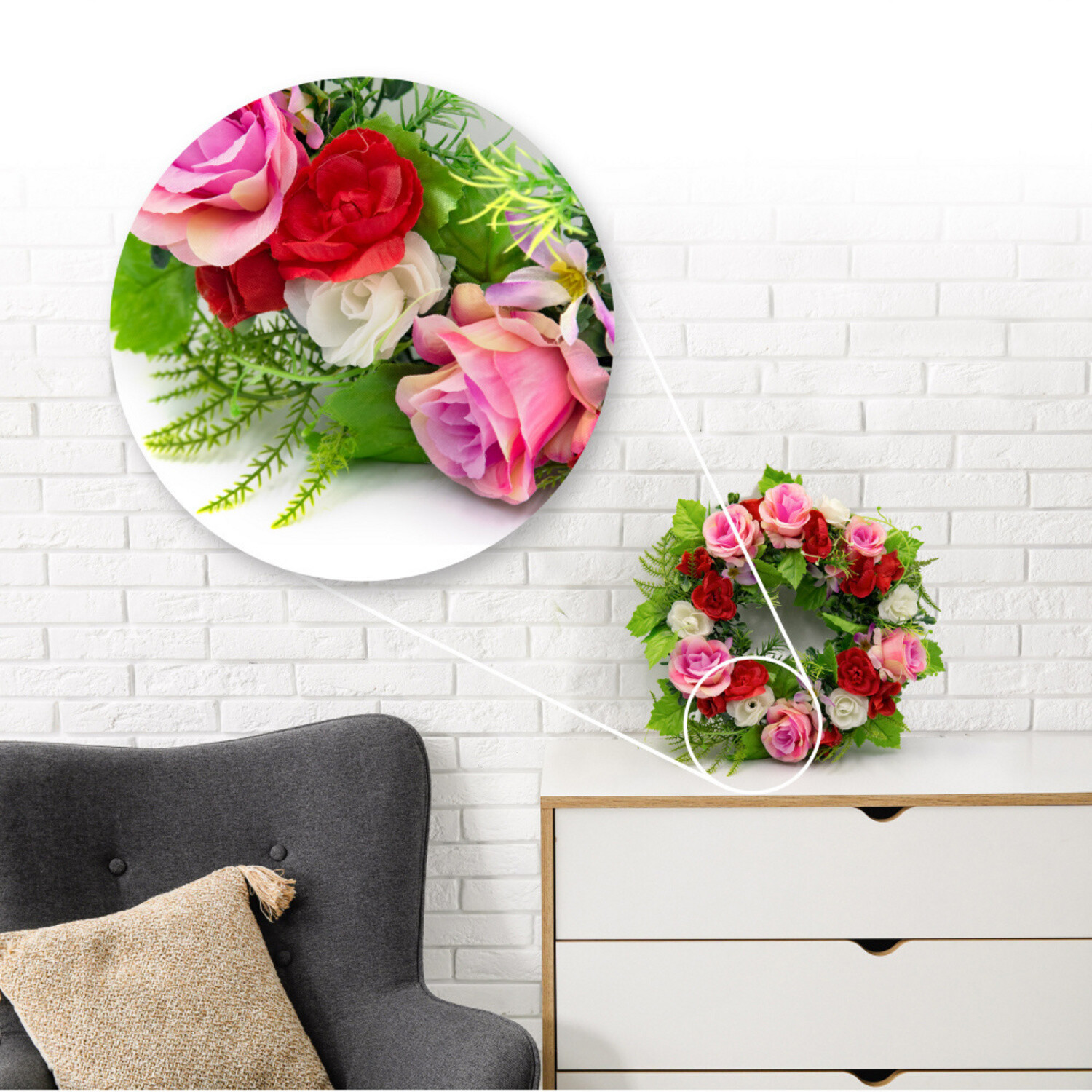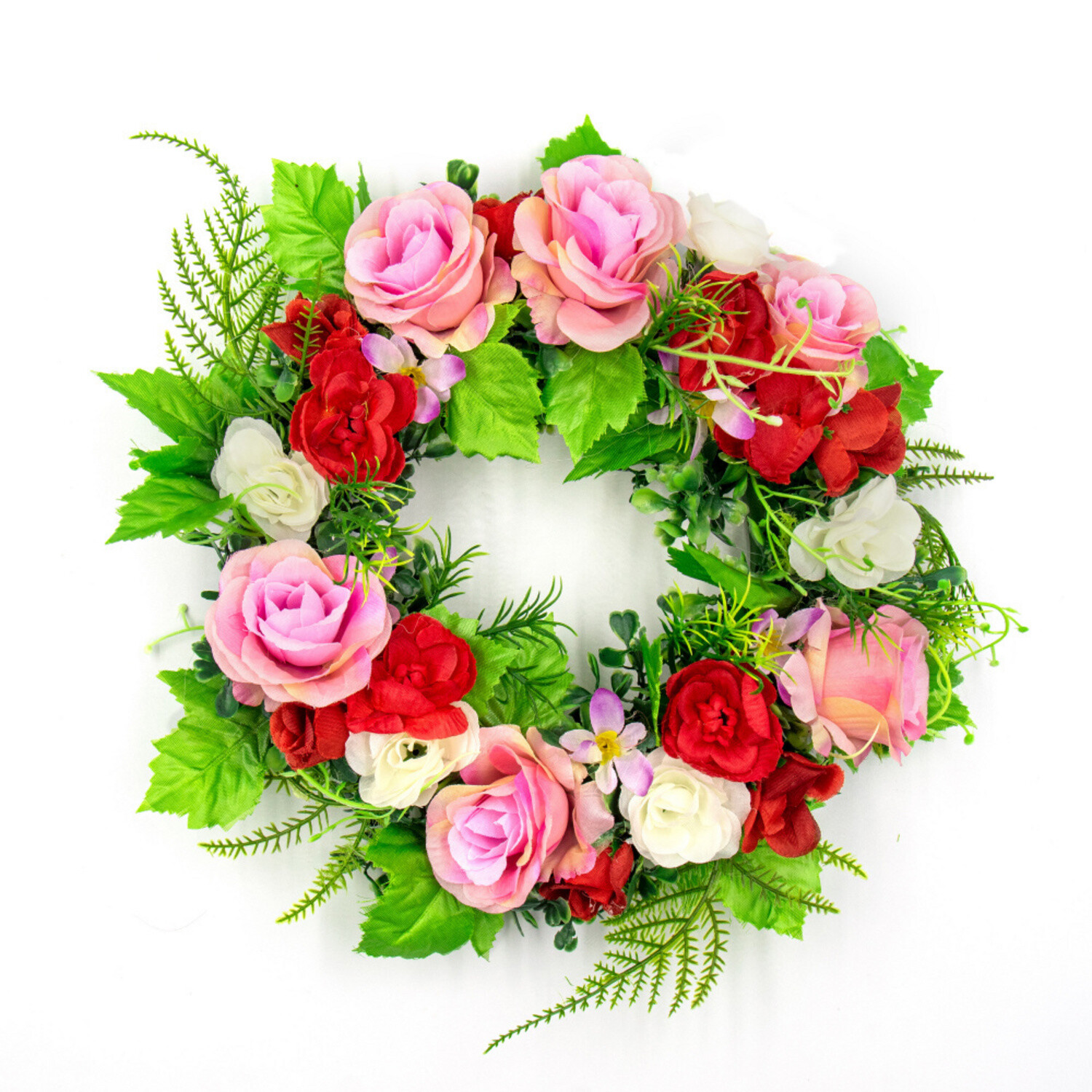 Ať už na vchodových dveřích či na stole – umělý dekorativní věnec z růží vypadá úžasně. Věnec o průměru 33 cm je romantickým a všestranným doplňkem s nádechem květinové elegance. Tento poutavý květinový věnec je bohatě zdoben umělými růžemi různých velikostí a barev, které vypadají jako právě rozkvetlé. Jemné textilní listy s realistickým žilkováním doplňují jeho přirozený vzhled. Věnec můžete využít mnoha způsoby – jako středobod dekorace na stole, třeba s LED svíčkou uprostřed, opřený o zeď na příborníku, nebo zavěšený na dveřích, okně či zdi. Díky ratanovému základu a kvalitním textilním květům je tento věnec ideální pro každou příležitost – ať už jako stylová dekorace pro váš domov nebo jako dárek.