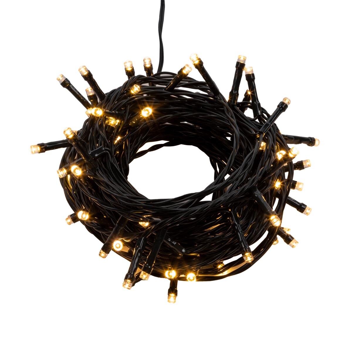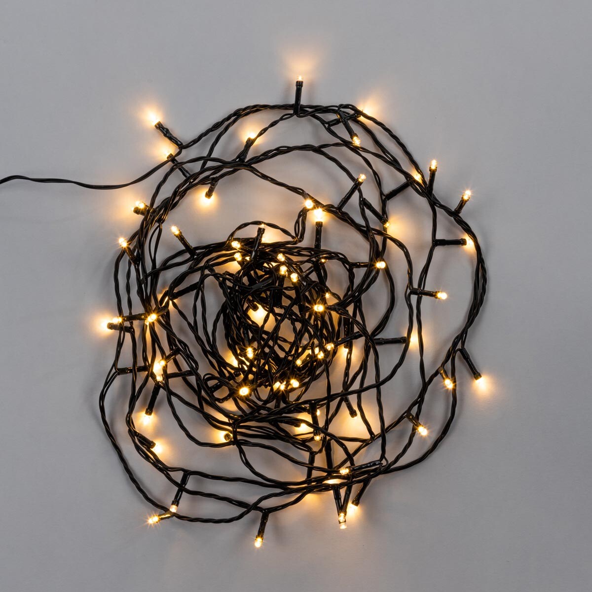 LED světelný řetěz s 100 teplými bílými diodami a časovačem je ideální pro venkovní i vnitřní dekoraci. Díky délce téměř 10 metrů a ochraně IP44 ho snadno použijete jako světýlka na stromeček, terasu nebo zahradu. Praktický časovač automaticky zapíná a vypíná světlo, čímž šetří energii a zjednodušuje použití. Síťové napájení. Rozměry: délka 990 cm.
