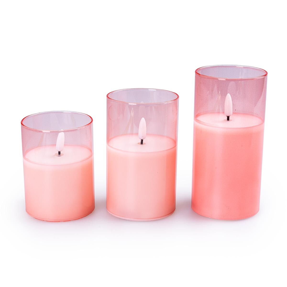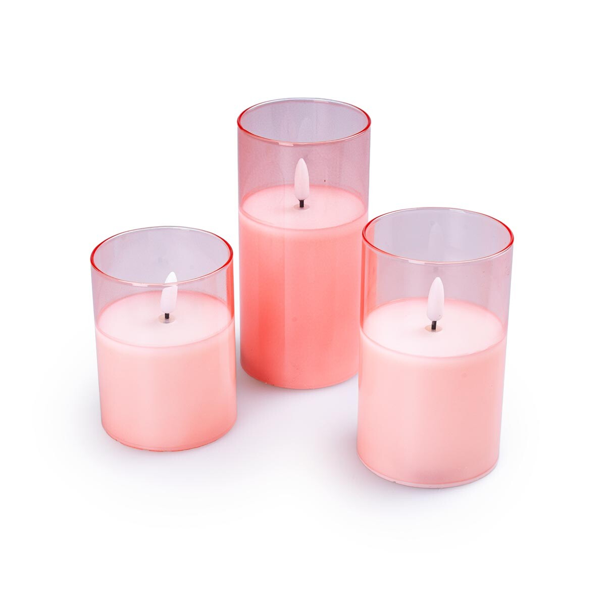 Půvabné LED svíčky ve skle naplní váš domov světlými okamžiky. Každá svíčka je umístěna ve sklenici. Díky bezpečné technologii LED můžete svíčky bezpečně umístit na poličku nebo je naaranžovat společně s módními sušenými květinami. Plamínek s LED diodou disponuje blikajícím efektem a je napájen bateriemi (3x AAA, nejsou součástí), takže odpadne starost s kapáním vosku a hledáním sirek či zapalovače. Stačí zmáčknout tlačítko a svíčky se nádherně rozzáří. Díky praktickému časovači se svíčky automaticky zapínají každý den ve stejnou dobu. Svíčky vypadají elegantně i bez zapnutého osvětlení. Rozměry: průměr 7,5 cm, výška 10 cm, 12,5 cm, 15 cm.