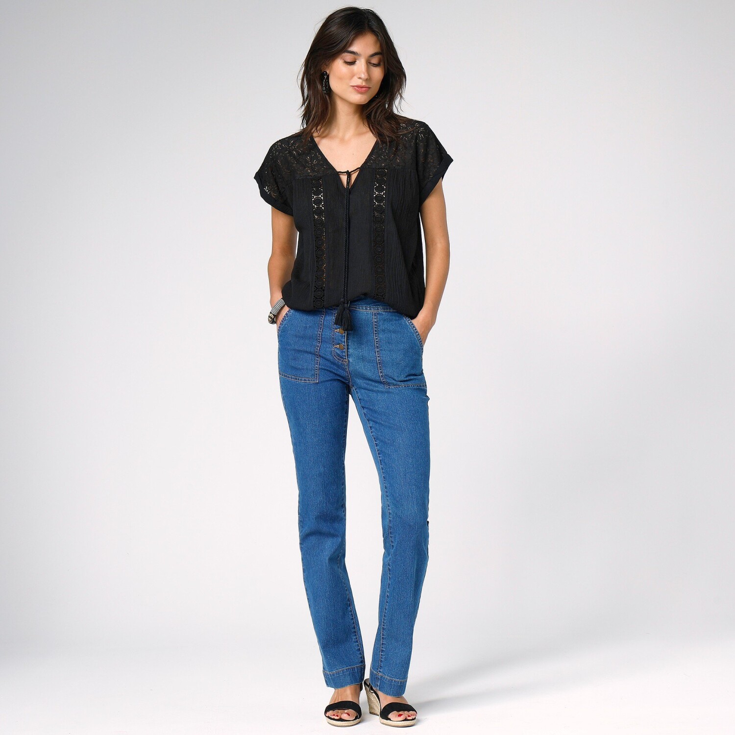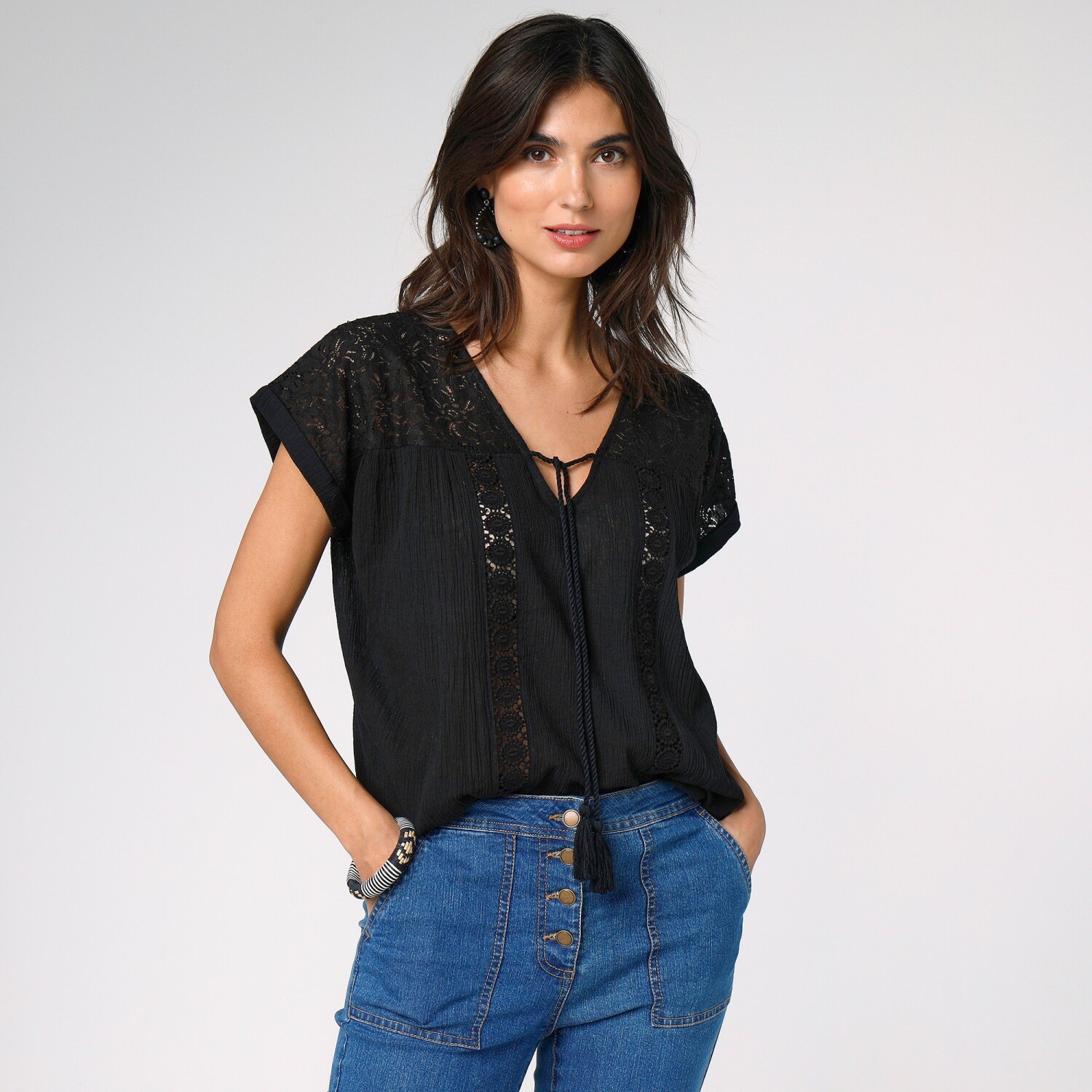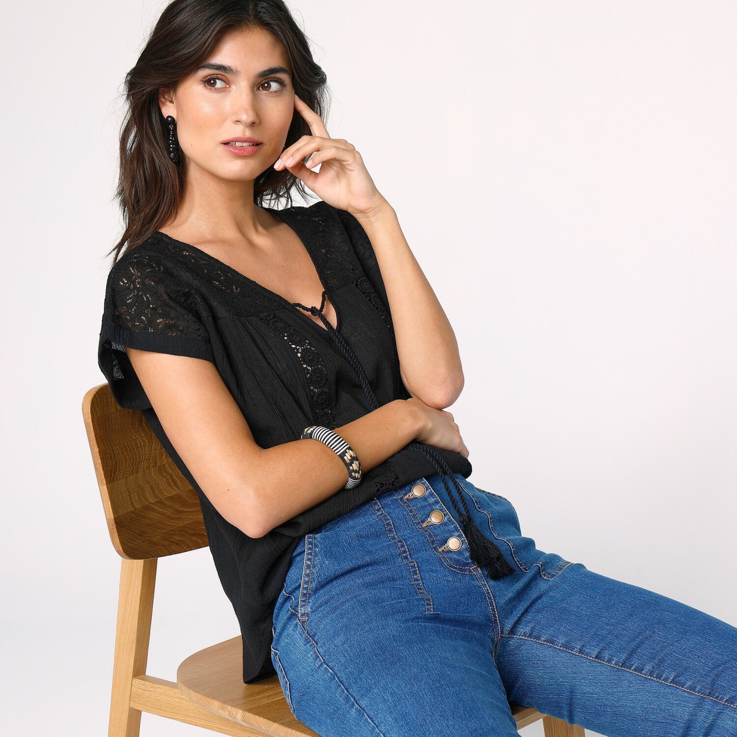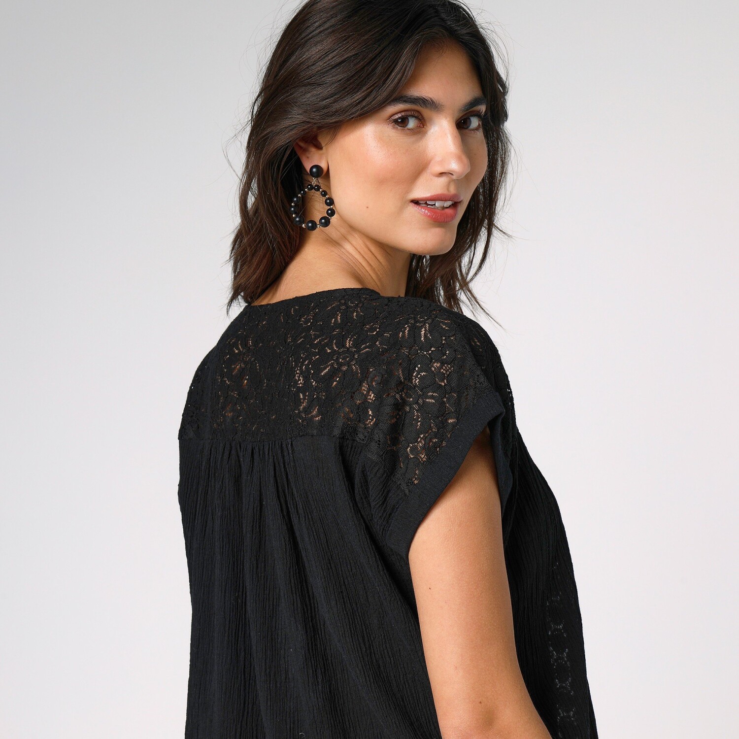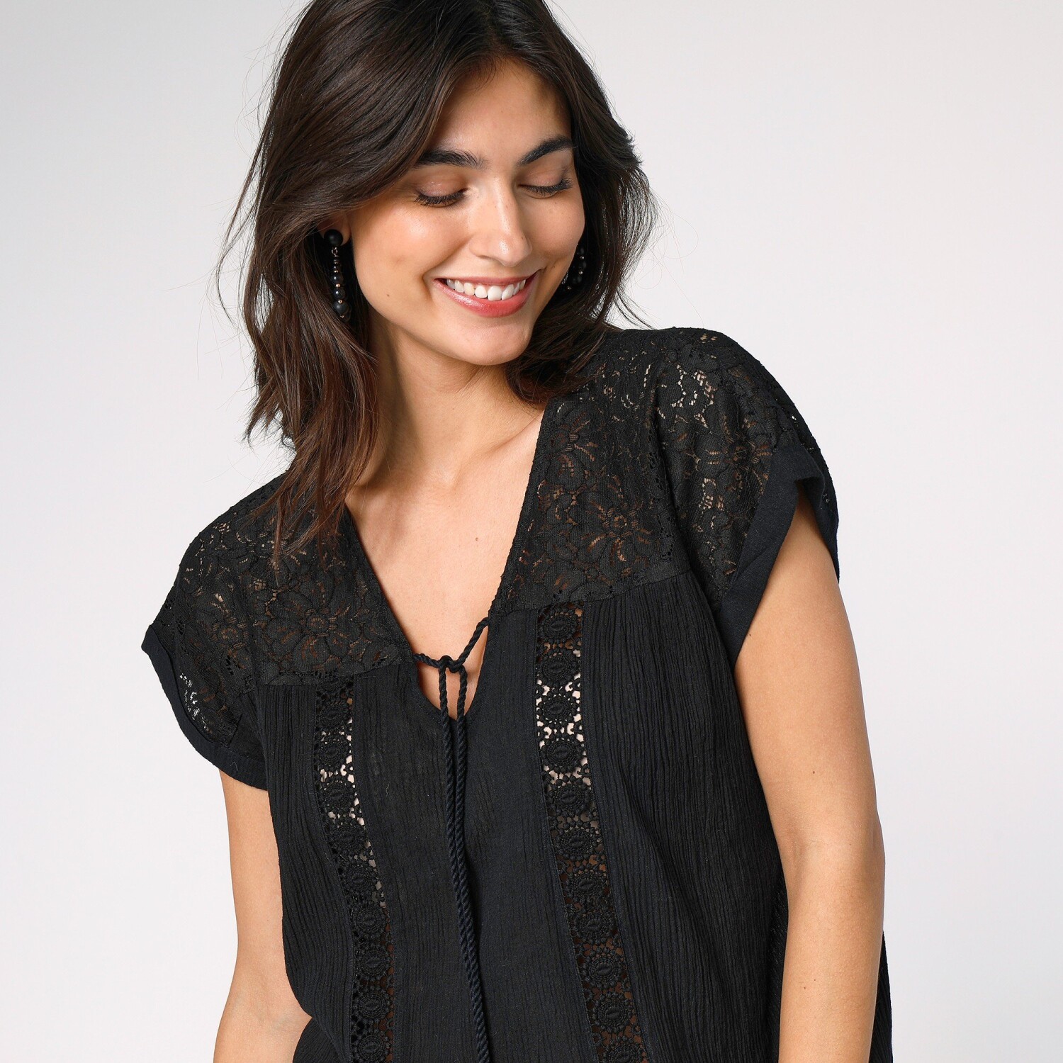 Jemná a lehoučká tunika vyniká svůdným macramé. Z gázoviny v pomačkaném vzhledu. Originální výstřih se šňůrkou na zavázání a střapce. Vpředu 2 macramé pruhy. Spadlá ramena a rukávy s ohrnutím. Vpředu i vzadu krajka a nařasení. Rovný spodní lem. Lze prát v pračce.