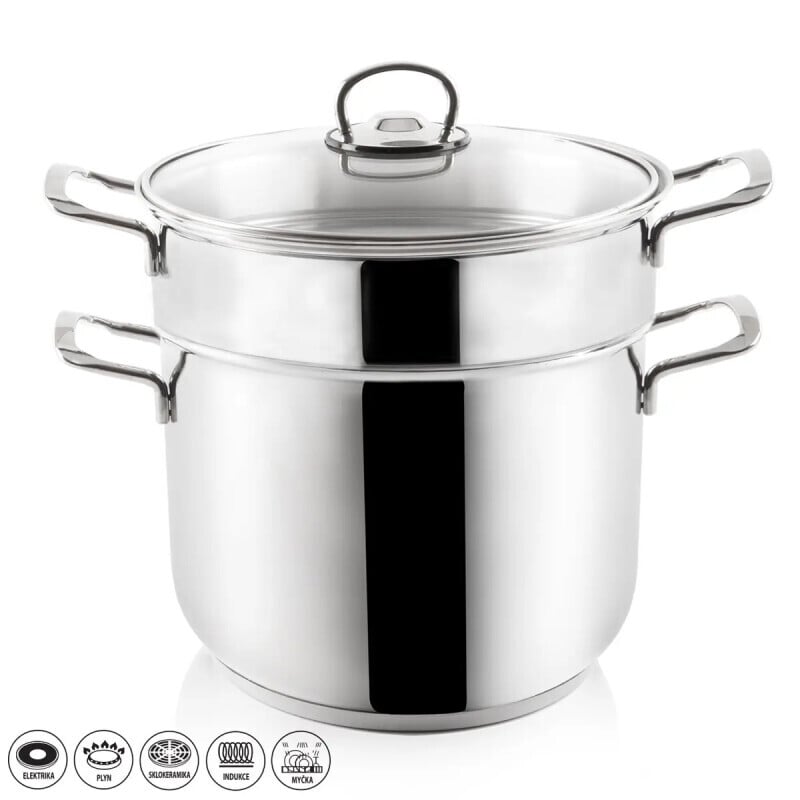 Napařovací hrnec ANETT je vhodný pro klasické vaření, ale využijete ho také pro vaření v páře, napařování knedlíků. Dvojitý napařovací hrnec je složený z hlavní nádoby, kam stačí nalít vodu, a z druhé nádoby s otvory na dně, do které vložíte pokrm. Takto lze napařovat houskové i sladké kynuté knedlíky, vařit zeleninu a dietně připravovat maso bez přidaného tuku nebo šetrně, ale rychle rozmrazit potraviny z mrazáku. Hlavní nádobu můžete používat i jako samostatný hrnec o objemu 5 l na vaření silných vývarů, příloh, omáček a dalších jídel, která máte rádi. Sestava obsahuje hrnec se sendvičovým dnem, 9 cm hluboký napařovací hrnec s otvory a skleněnou poklici s otvorem pro únik páry. Hrnec je vhodný na všechny typy tepelných zdrojů i do myčky na nádobí. Díky kvalitní nerezové oceli můžete bez obav používat i kovové kuchyňské náčiní. Ergonomické rukojeti zajistí bezpečnou manipulaci. Silné sendvičové dno šetří energii. Materiál: kvalitní nerezová ocel třídy 304, sklo. Rozměry: objem 5 l, průměr 22 cm, výška celé sestavy 26 cm.