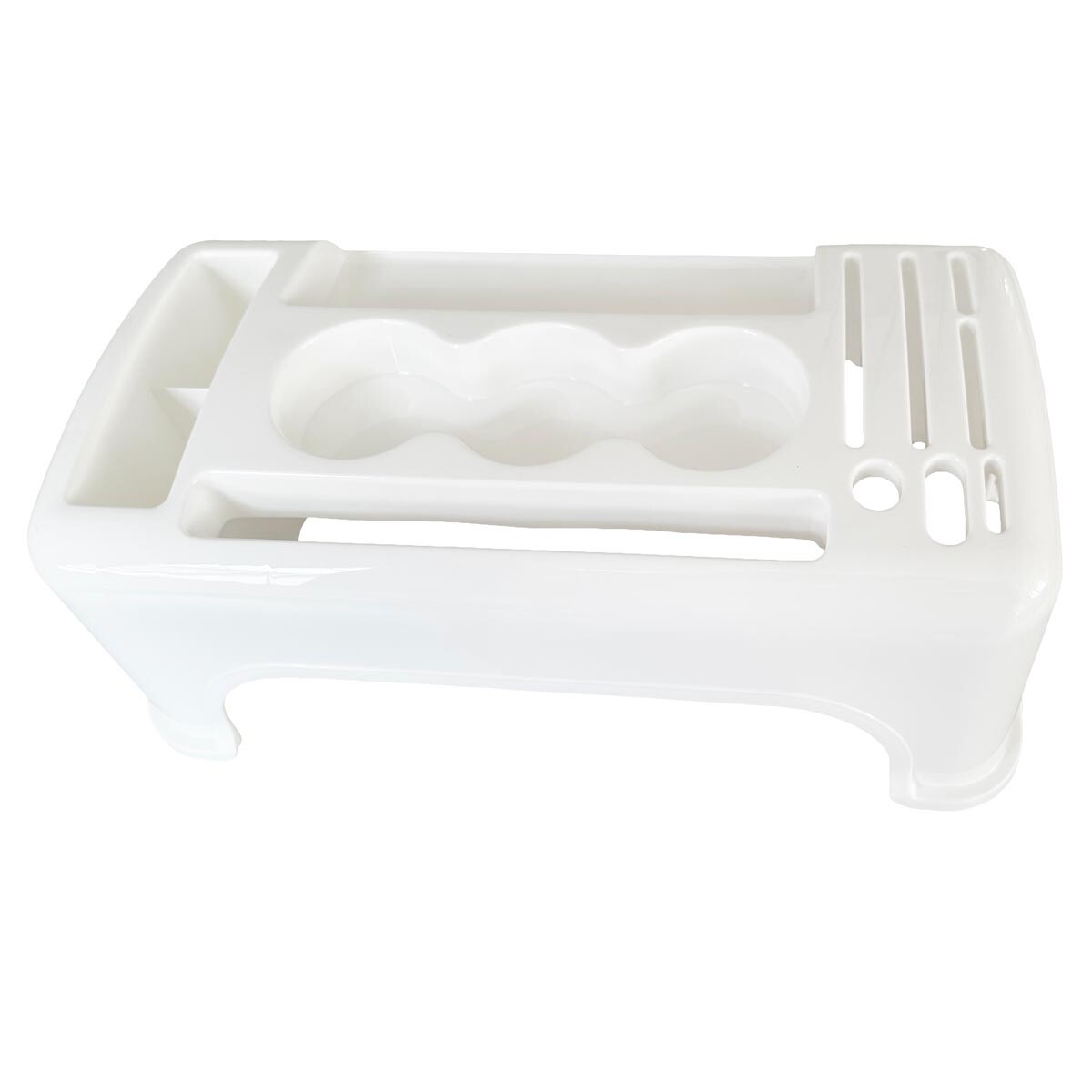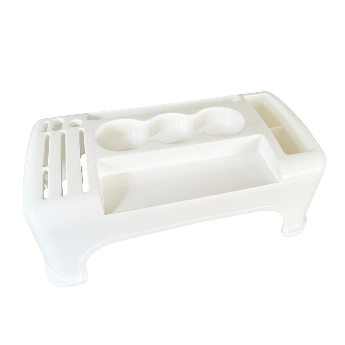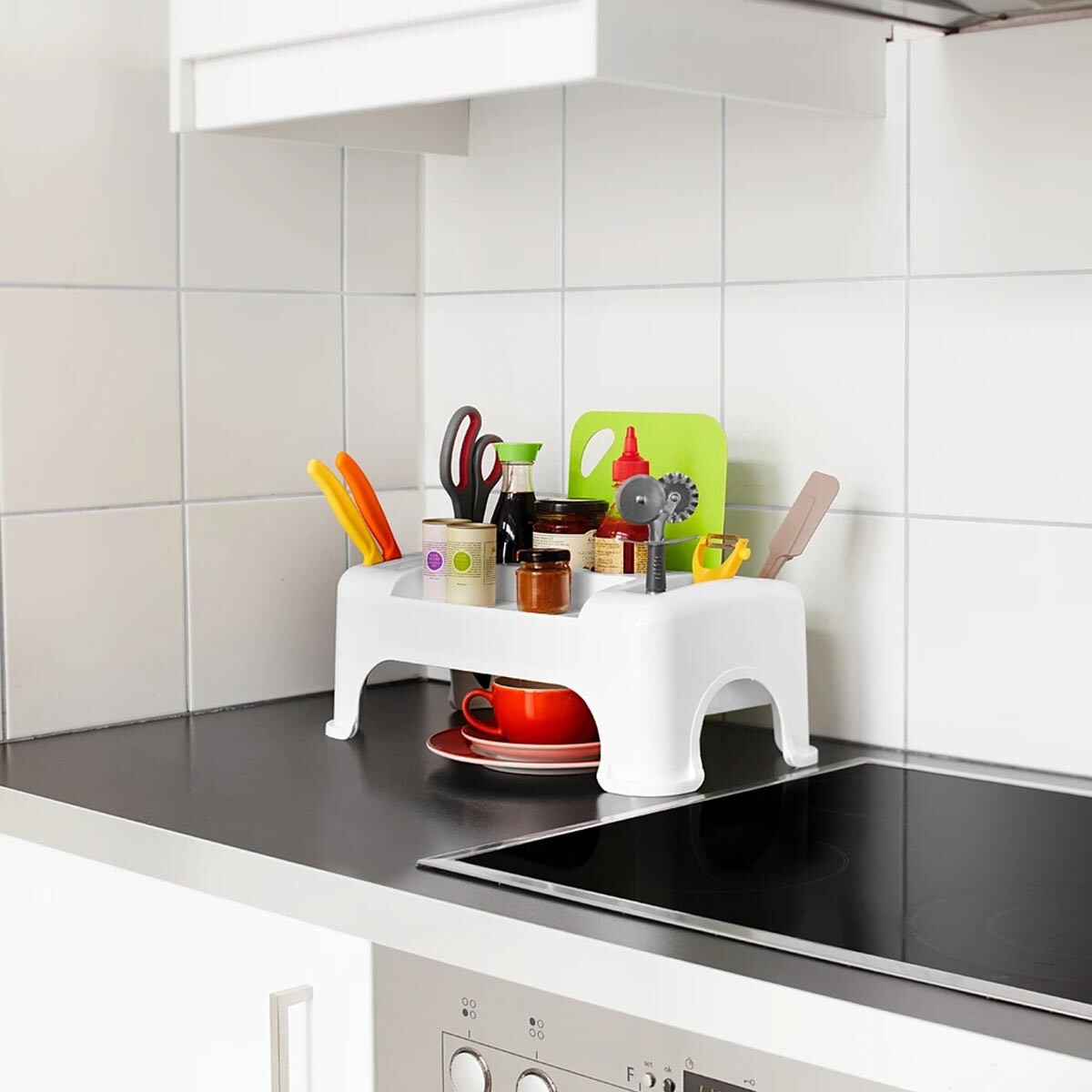Tento přídavný plastový organizér na kuchyňskou linku vám pomůže efektivně využít prostor a udržet pořádek. Horní část je ideální pro uložení příborů, nožů, kuchyňských pomůcek, kořenek či dochucovadel, které tak budete mít vždy po ruce. Díky vyvýšené konstrukci lze pod organizér pohodlně umístit talíře, misky nebo jiné drobné předměty. Materiál: plast. Rozměry: 15 x 43 x 23 cm.