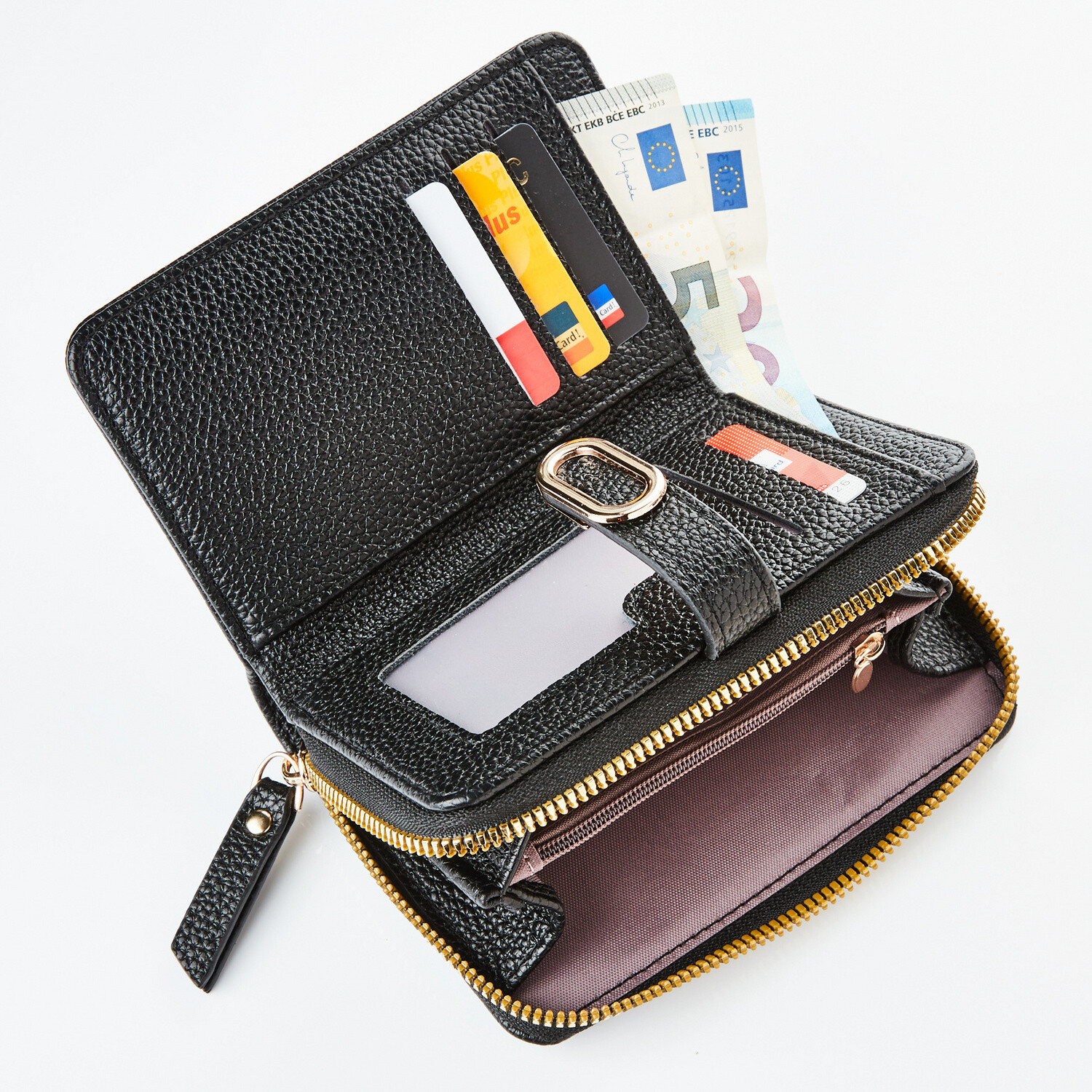 Jedna část peněženky s přihrádkami na bankovky a mince, druhá část pouzdro na karty s pěti přihrádkami a dvěma bočními kapsami. Vše je uvnitř a lze jej otevřít samostatně. S RFID ochranou proti krádeži dat. Na karty a peníze.