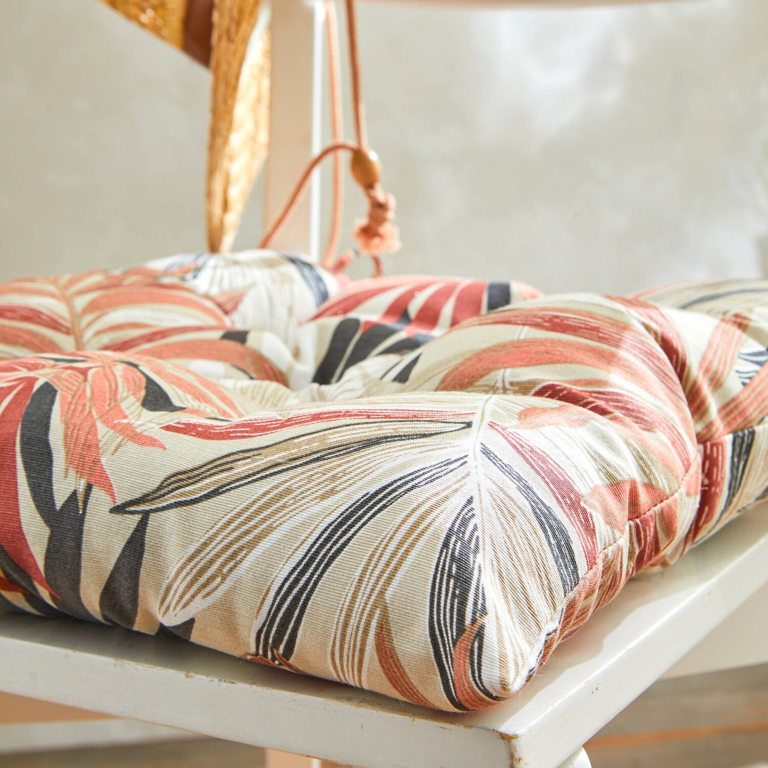 Sada 2 podsedáků na židli s potiskem listů přinese do Vašeho interiéru nádech exotiky. Sada 2 podsedáků na židli s potiskem listů, 2 stejné strany. Pečlivé zakončení. Prošití do bodů a šňůrky na zavázání. V sadě 2 stejných kusů. Pro ochranu životního prostředí doporučujeme prát na 30 °C a sušit na vzduchu.