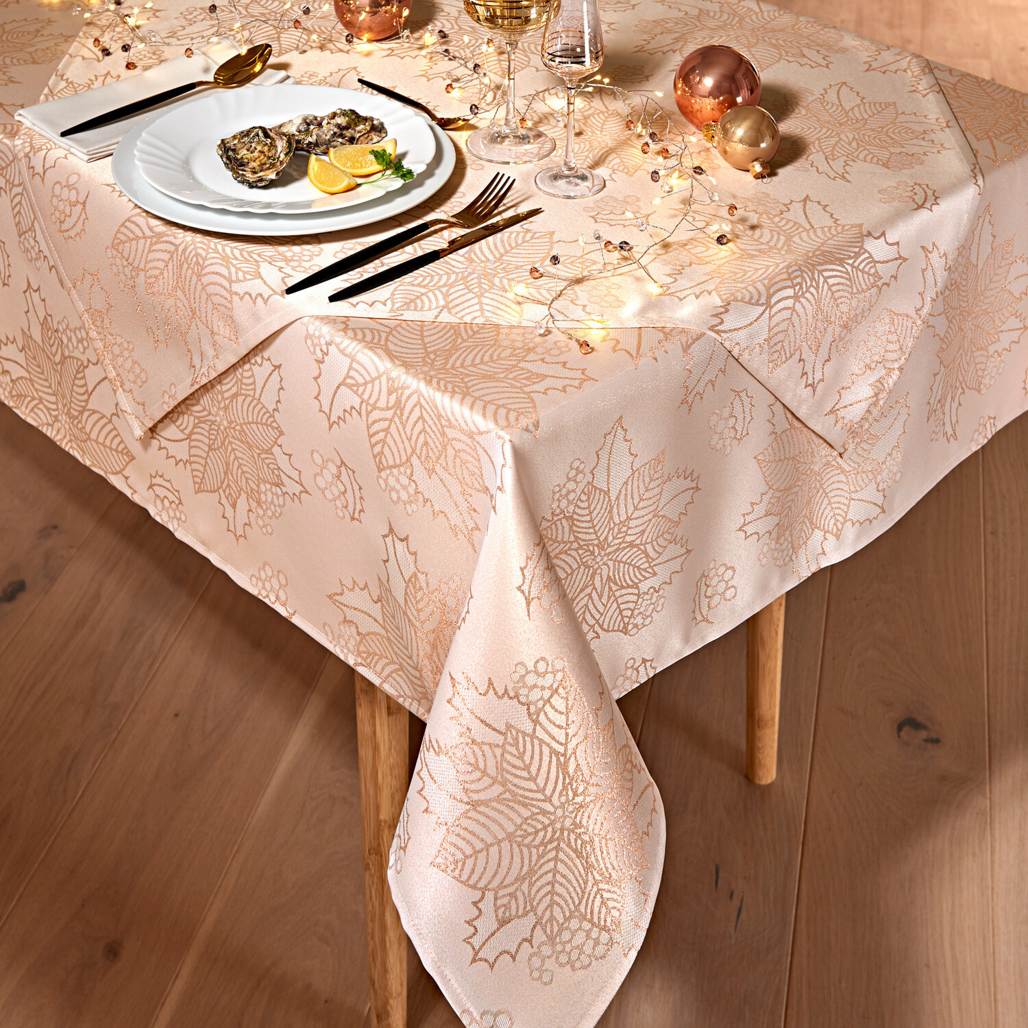 Jemné růžovozlaté vzory na sněhobílém saténu! Tento elegantní žakárový ubrus dodá Vaší slavnostní tabuli výjimečný vzhled. Třpytivá látka s efektem třpytivého vzoru. Jednoduchá údržba. 4 velikosti.
