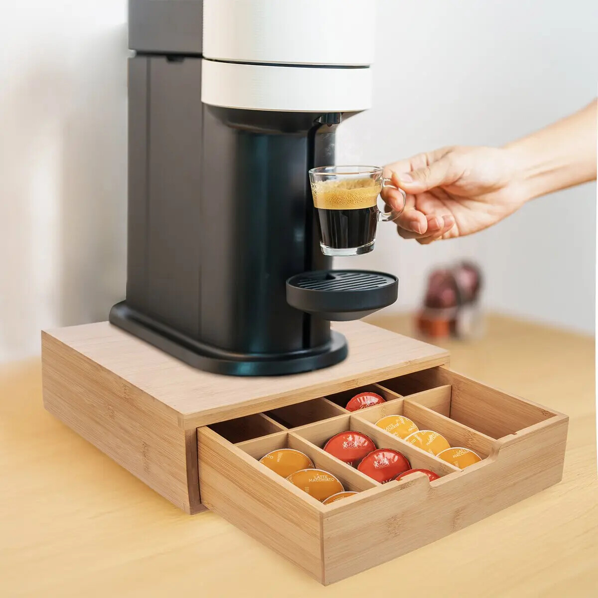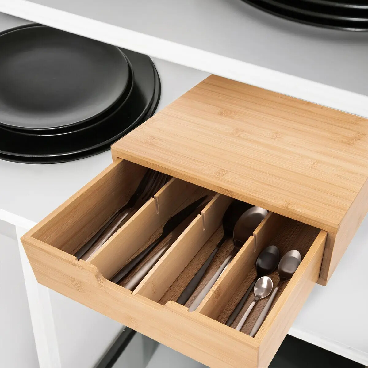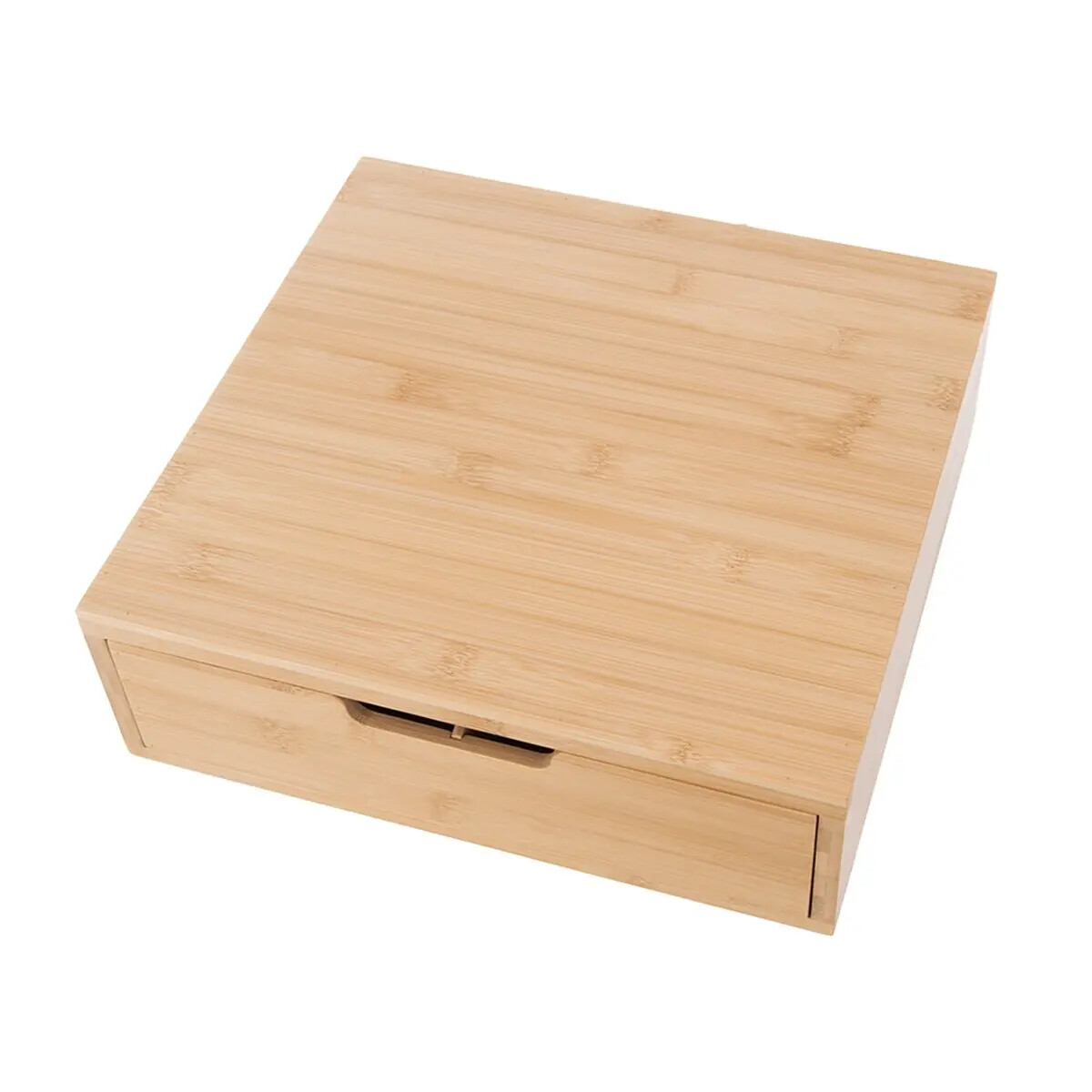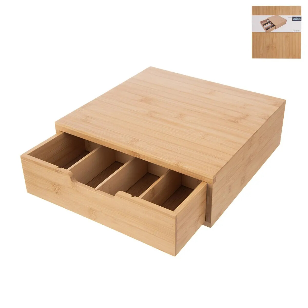 Tento bambusový zásobník je praktickým a elegantním řešením pro organizaci vaší domácnosti. Díky odnímatelným vnitřním dílům si snadno přizpůsobíte velikost přihrádek podle potřeby, ať už jde o kapsle na kávu, čajové sáčky, příbory nebo kosmetiku. Jeho multifunkční design umožňuje využití nejen v kuchyni, ale i v koupelně či pracovním prostoru. Můžete ho umístit jako stojánek pod kávovar, což přidá vaší kuchyni na pořádku a stylu. Skvěle poslouží také na toaletním stolku pro uspořádání šperků a kosmetických potřeb. Materiál: bambus. Rozměry: 31,5 x 30 x 10 cm.